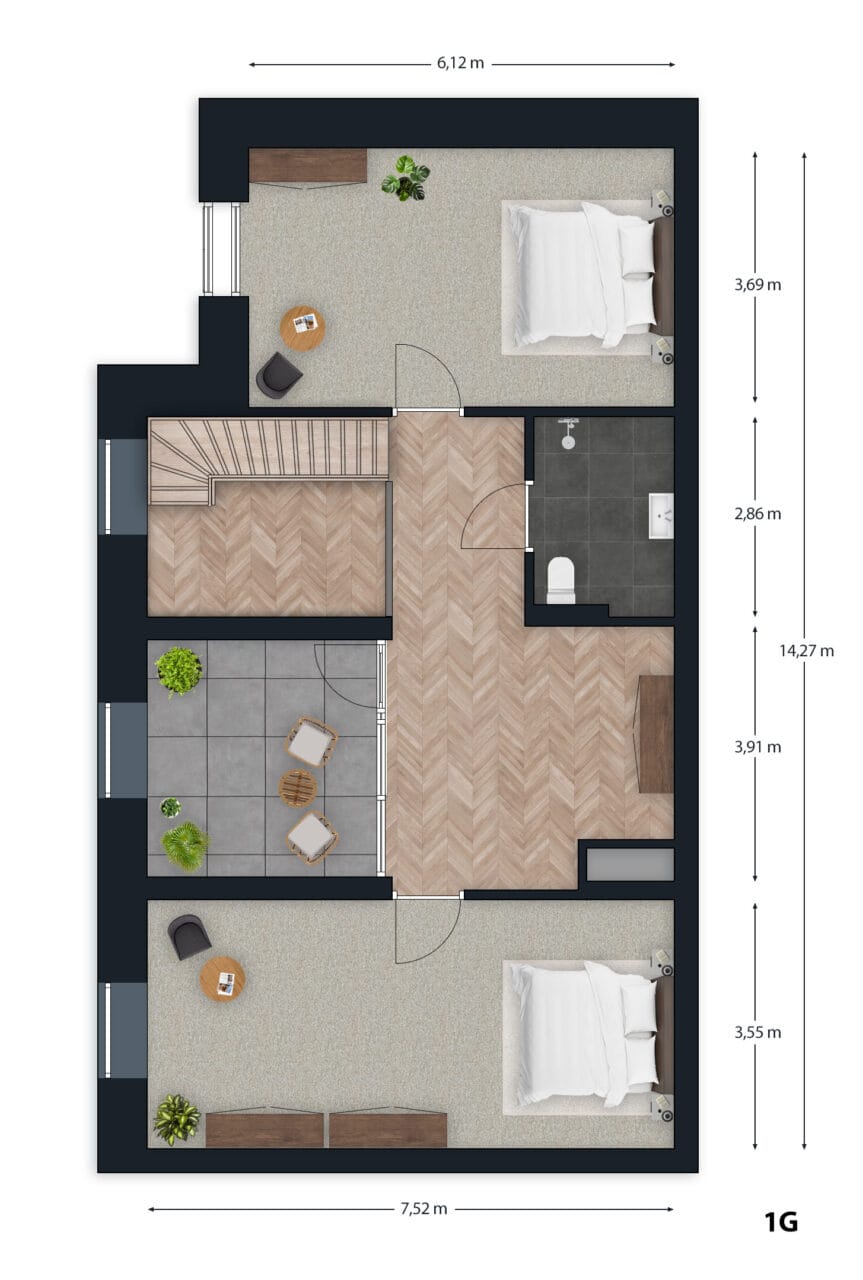 Appartement Jachthavenstraat 1-G ligt op de 1e en 2e verdieping aan de noordoostzijde van het gebouw en heeft een loggia op het noorden. Het appartement heeft een gebruiksoppervlak wonen van ca. 149m2 met o.a. een living van ca. 57m2 met Franse balkons en twee slaapkamers en een badkamer op de de 2e woonlaag.