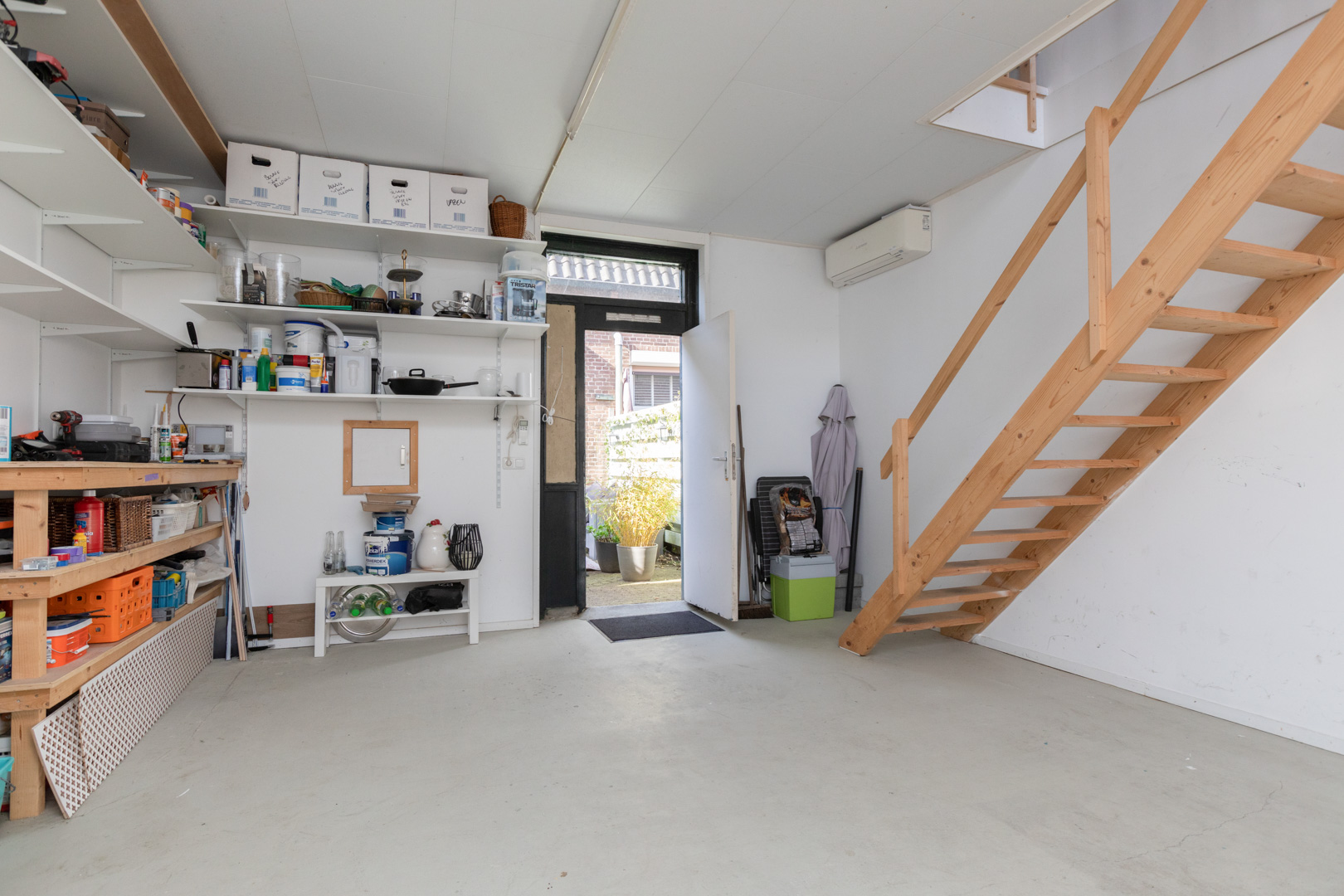 Dit voormalige woonhuis heeft een eigen voordeur en ramen met fraai glas-in-lood, aan de achterzijde. De begane grond is ca. 25m2 en is thans in gebruik als bergruimte. Deze ruimte is zeer geschikt als extra woonruimte, kantoor of als Bed & Breakfast. Voor de thuiswerker is op de 1e verdieping is nog ca. 22m2 extra ruimte welke tevens als slaap-/woonruimte kan worden gebruikt. Het geheel is geïsoleerd (m.u.v. de betonvloer op de begane grond) en voorzien van kunststof kozijnen. Verwarming/koeling middels 2 airco units.