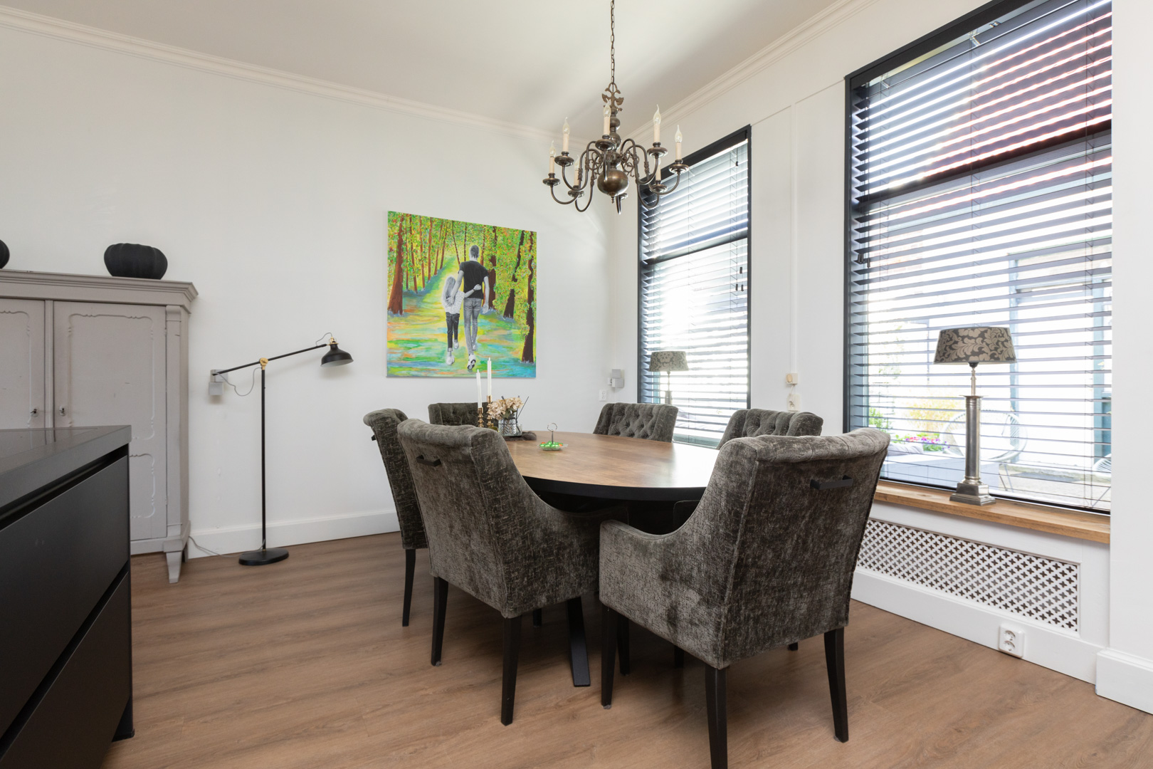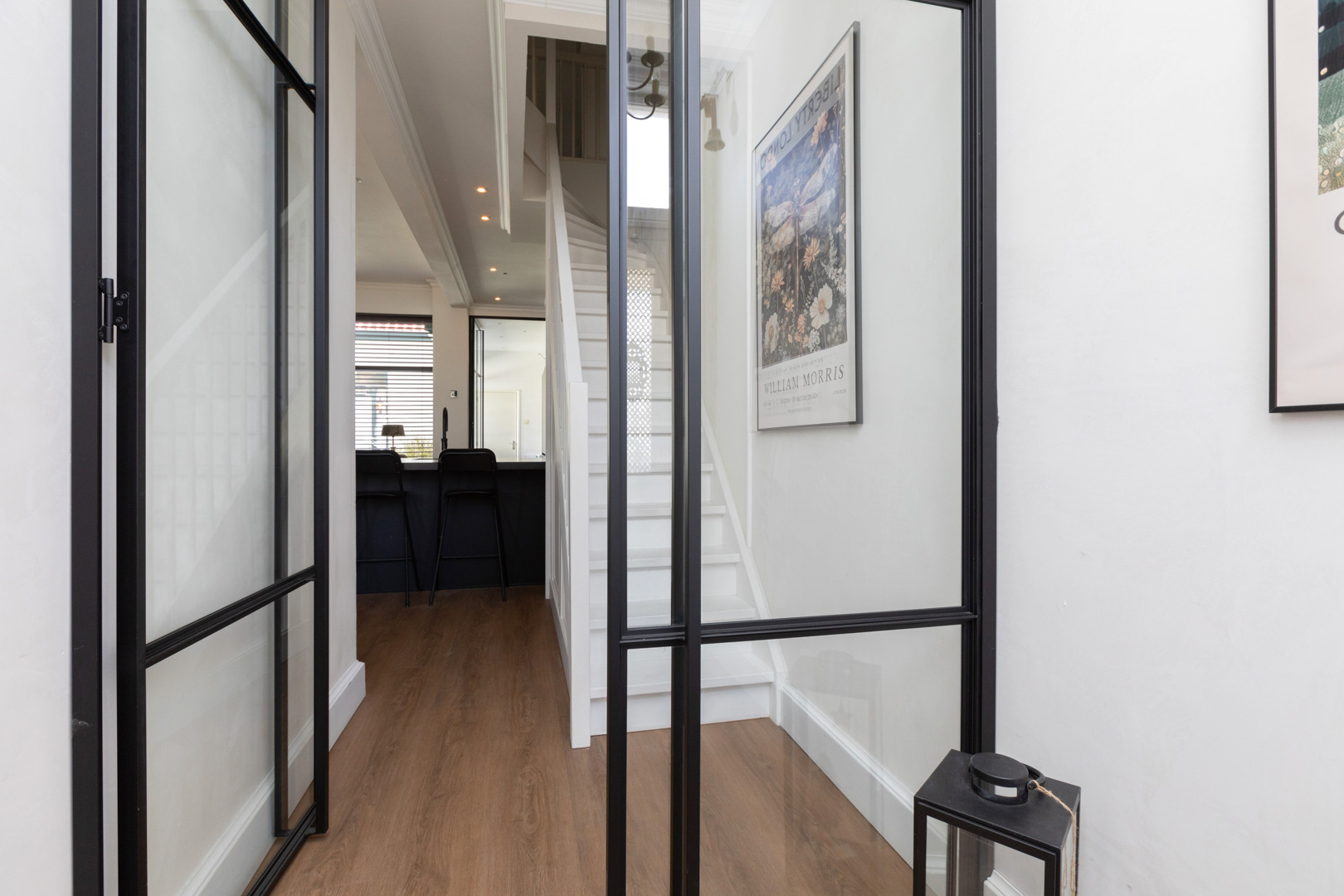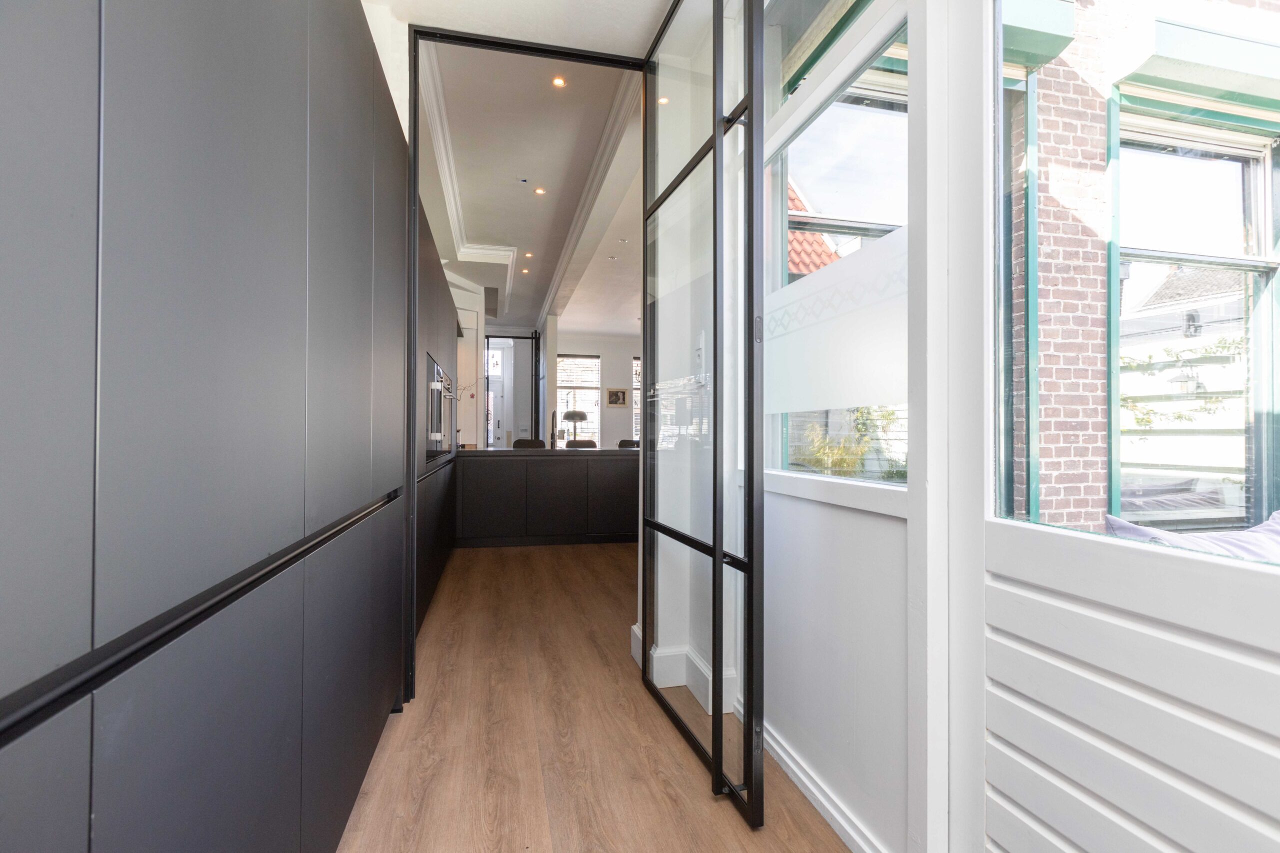 Entree/vestibule met fraaie klassieke voordeur en dubbele stalen deuren met glas naar de living. Meterkast (uitgebreid/kookgroep/4x aardlek). Nieuwe comfortabele trapopgang met trap-/provisiekast en schoenenkast. Ruime en heerlijk lichte living met open keuken (totaal ca. 45m2). De afwerking is in een lichte kleurstelling, er zijn brede vensterbanken, het plafond is maar liefst 3.15m oog en op de vloer ligt een moderne pvc vloer met vloerverwarming. In de zithoek aan de voorzijde is een rookkanaal met houtkachel. De keukeninrichting met bar is vernieuwd in 2021 en voorzien van diverse inbouwapparatuur (Siemens Studioline: combi-oven, koel-/vriescombinatie, wijn klimaatkast, vaatwasmachine, koffiezetter. Een Bora inductie kookplaat met geïntegreerde afzuiging. Een Quooker kokend water kraan met boiler). Stalen deur met glas naar de bijkeuken (ca. 6m2) met bijpassende, en op de keukeninrichting aansluitende, kastenwand en wasmachine aansluiting. Moderne wc, met beton ciré afgewerkte wanden, ingericht met wandcloset en fonteintje. De vrij gelegen stadstuin (ca. 20m2) is voorzien van sierbestrating en heeft een achterom via een steeg. Vanuit de tuin is toegang tot het bijgebouw. Strook tuin met hekwerk, aan de voorzijde.