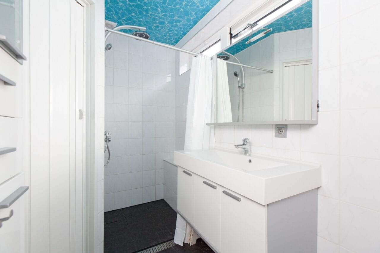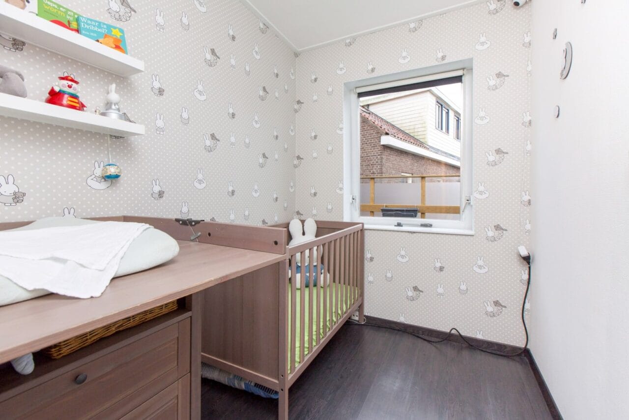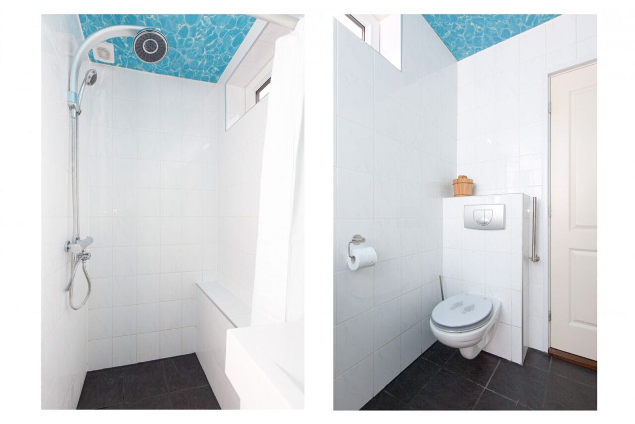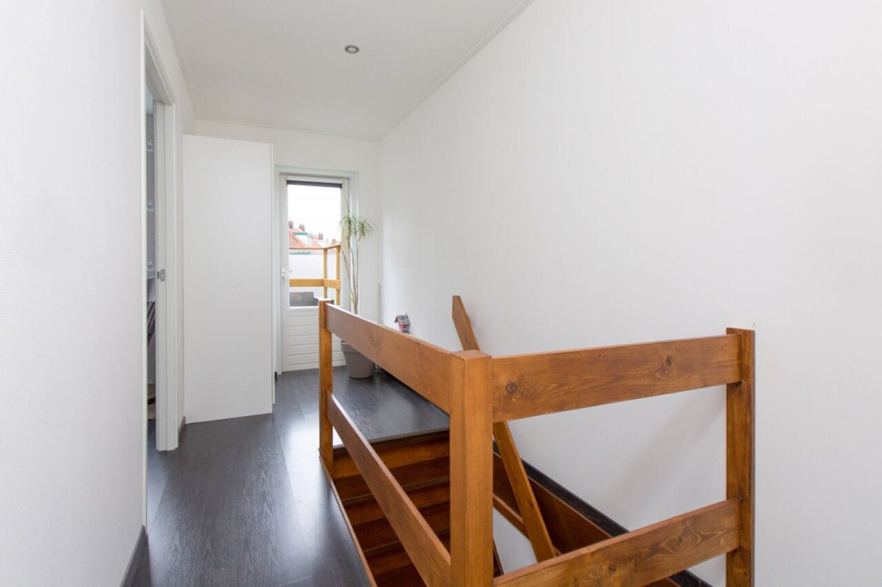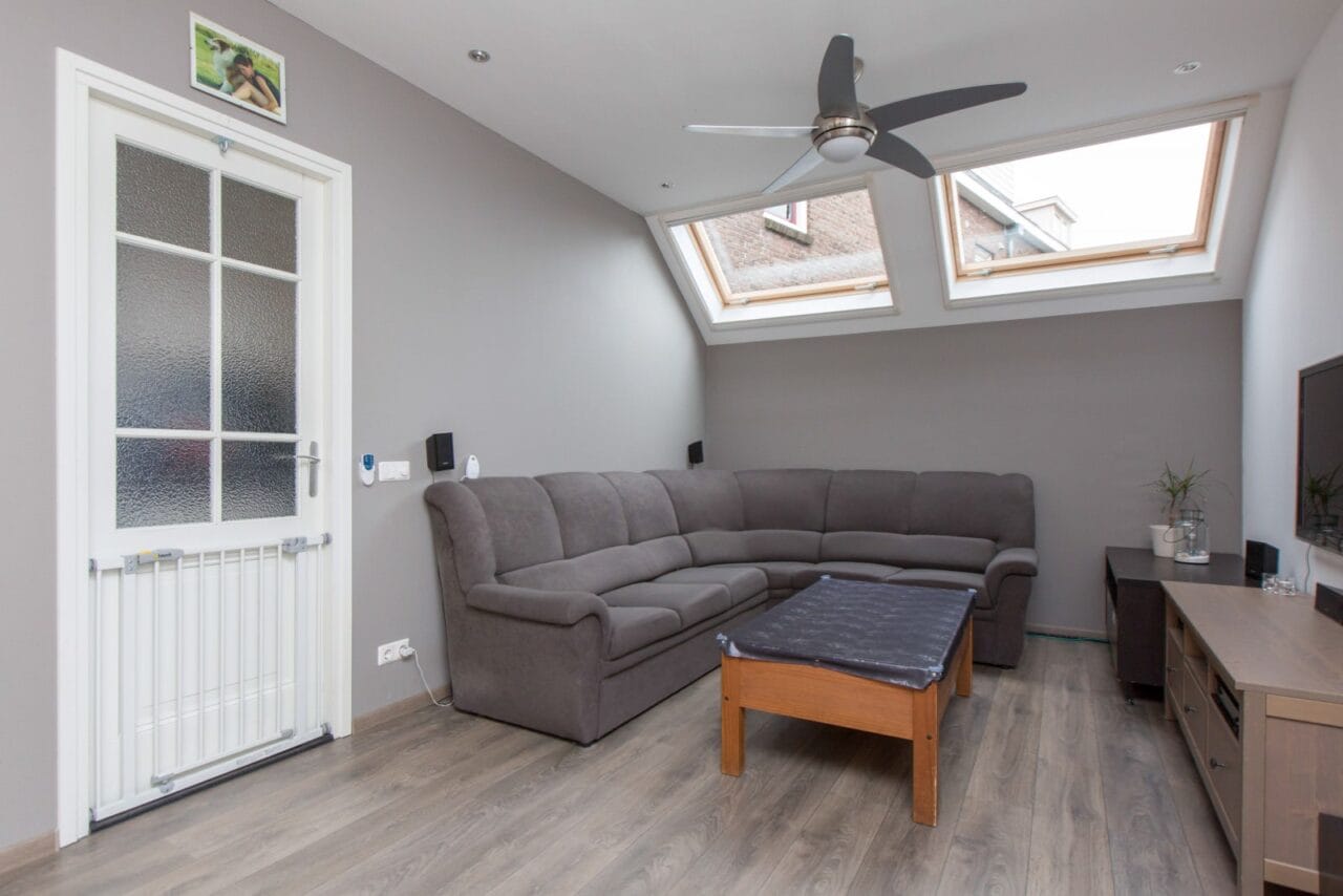 Ruime overloop en twee slaapkamers (ca. 4 en 9m2) voorzien van laminaatvloer. Ruime volledig betegelde badkamer (ca. 6m2) ingericht met inloop-/regendouche, wastafelmeubel met kast, 2e toilet (wandcloset), mechanische ventilatie, plafond met inbouwverlichting en mechanische ventilatie. Deur naar ruim (ca. 15m2) dakterras op het zuiden gesitueerd en met veel privacy!