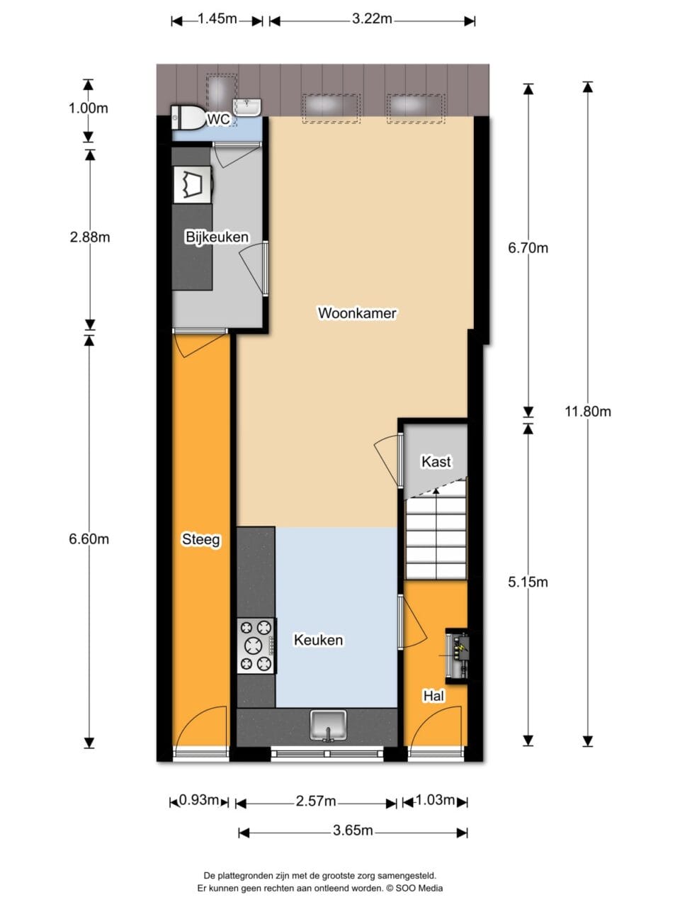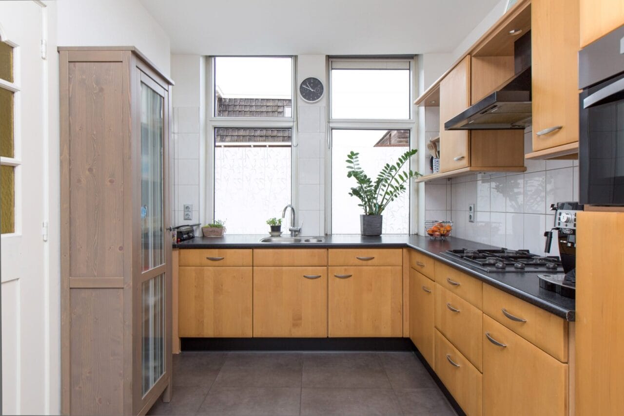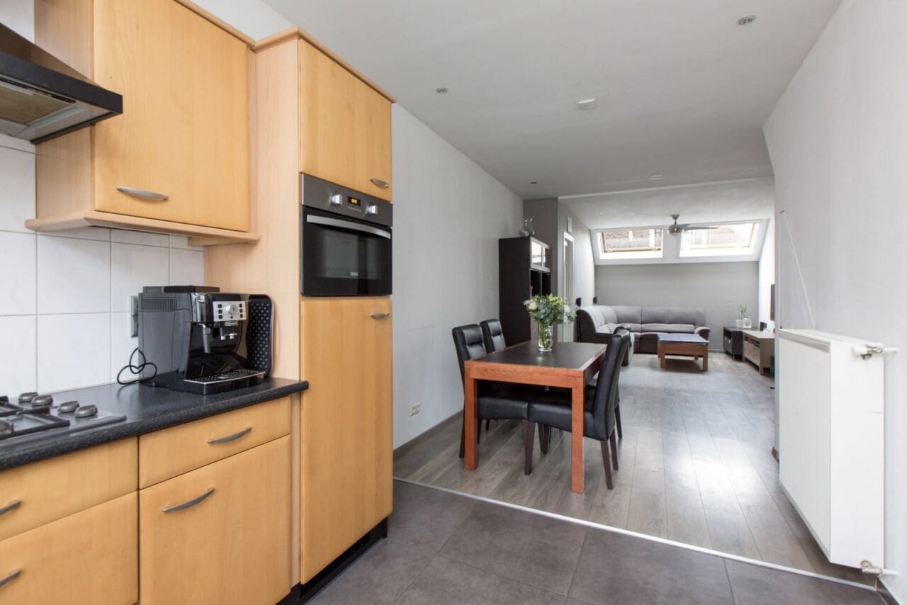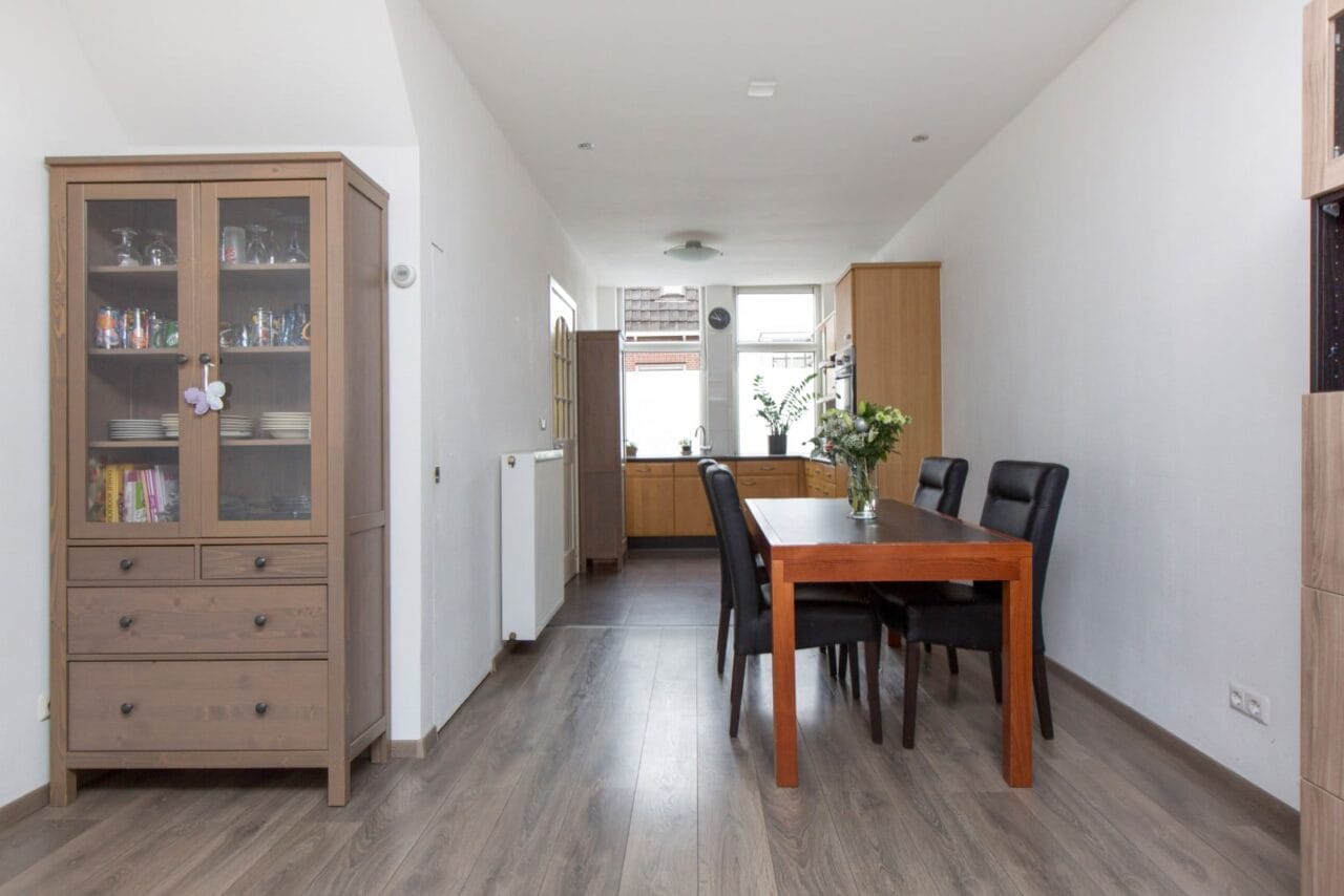 Entree/hal met tegelvloer. Meterkast (6 gr./2x aardlek). Trapopgang. Keuken (ca. 8m2) met tegelvloer en moderne inrichting in hoekopstelling met inbouwapparatuur (combi-magnetron, koeler, vaatwasmachine, 4 pits gaskookplaat en een wasemkap). Provisie-/cv-kast. Ruime woonkamer (ca. 32m2) met moderne laminaatvloer, plafond met inbouwverlichting en 2 dak-/kantelramen aan de achterzijde. Bijkeuken met tegelvloer en werkblad en boven- en onderkasten en aansluiting wm/wd. Moderne wc ingericht met wandcloset, wastafel en dak-/kantelraam. Toegang vanuit de bijkeuken naar de eigen steeg/berging. De steeg is aan de straatzijde afsluitbaar.