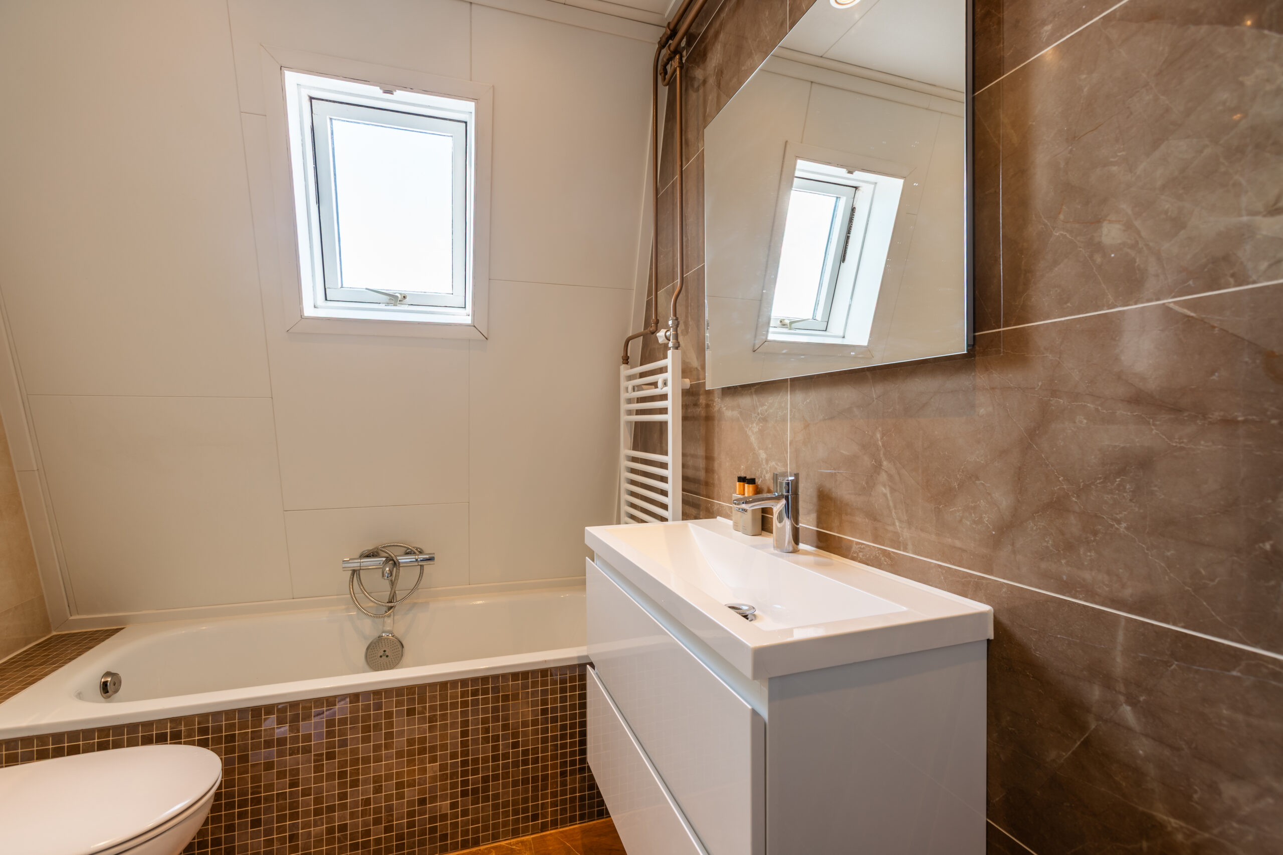 Overloop en drie slaapkamers (ca. 4, 10 en 10m2) met laminaatvloer. Moderne volledig betegelde badkamer (vernieuwd in 2020) ingericht met ligbad, douche, wastafelmeubel, 2e toilet (wandcloset) en een dak-/kantelraam.