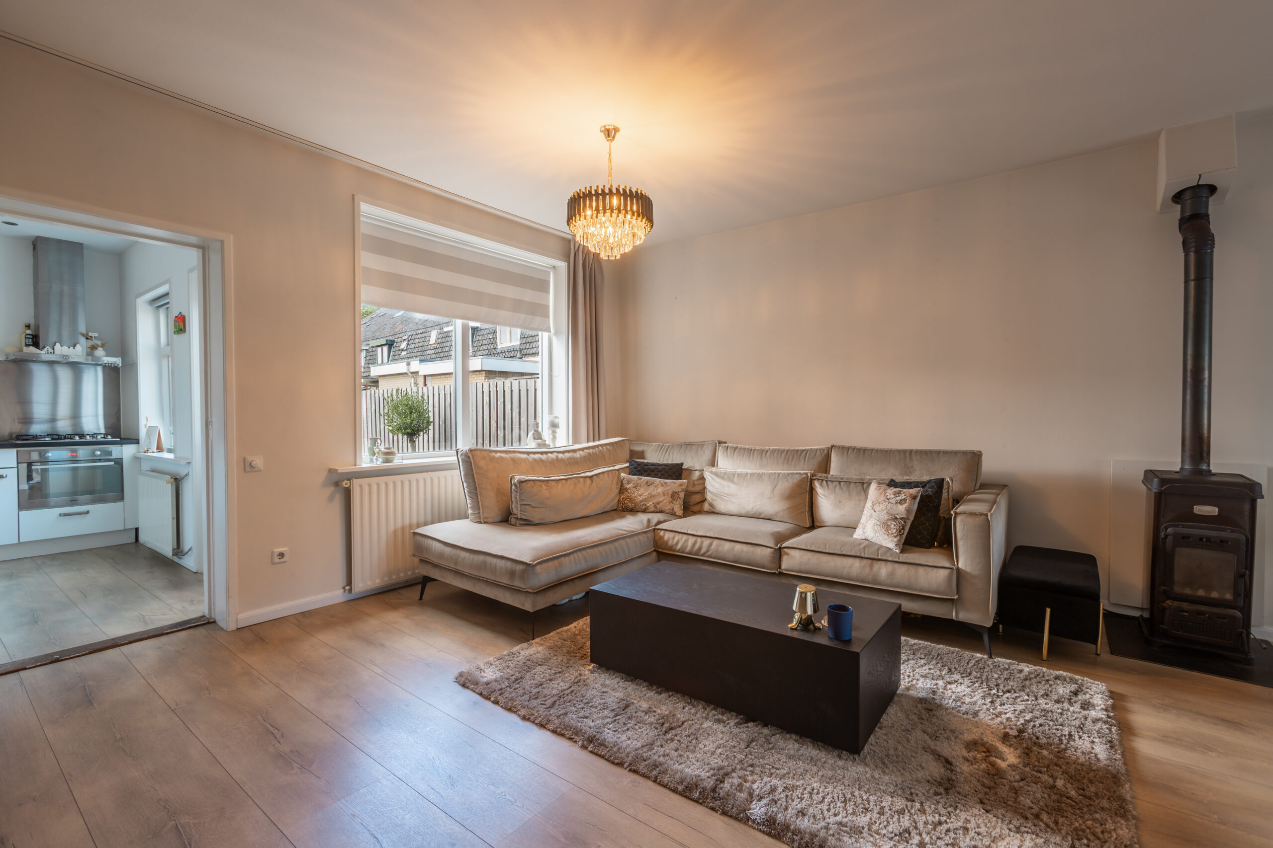 Entree/hal. Wc. Trapopgang met trapkast. Meterkast (4 gr./aardlek). Ruime L-woonkamer (ca. 28m2) met uitstekende lichtinval, een stucplafond, moderne laminaatvloer en een rookkanaal met houtkachel (ter overname). Aangebouwde keuken (ca. 7m2) met moderne inrichting (vernieuwd in 2017) in hoekopstelling met inbouwapparatuur (koeler, vaatwasmachine, combimagnetron, gaskookplaat en afzuigkap). Aangebouwde was-/stookruimte/berging (ca. 9m2) met opstelling cv-combiketel en aansluiting wasmachine/wasdroger. Berging (ca. 4m2) ideaal voor fietsen en/of motor. Ca. 14m diepe, zonnige, diepe, achtertuin met eigen achterom. Recente schutting, gazon, zonneterras. Aangelegde voortuin met fraai hekwerk.