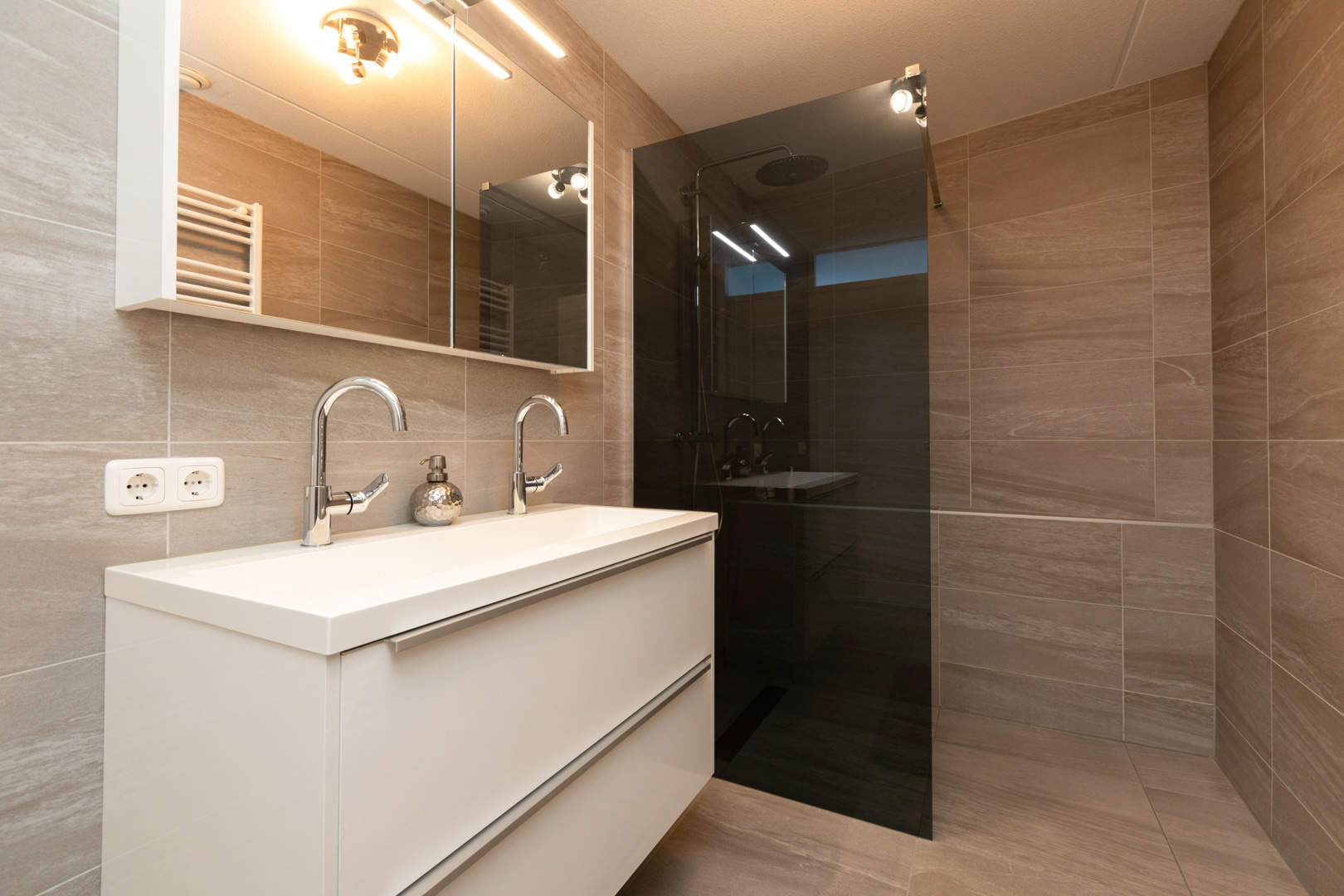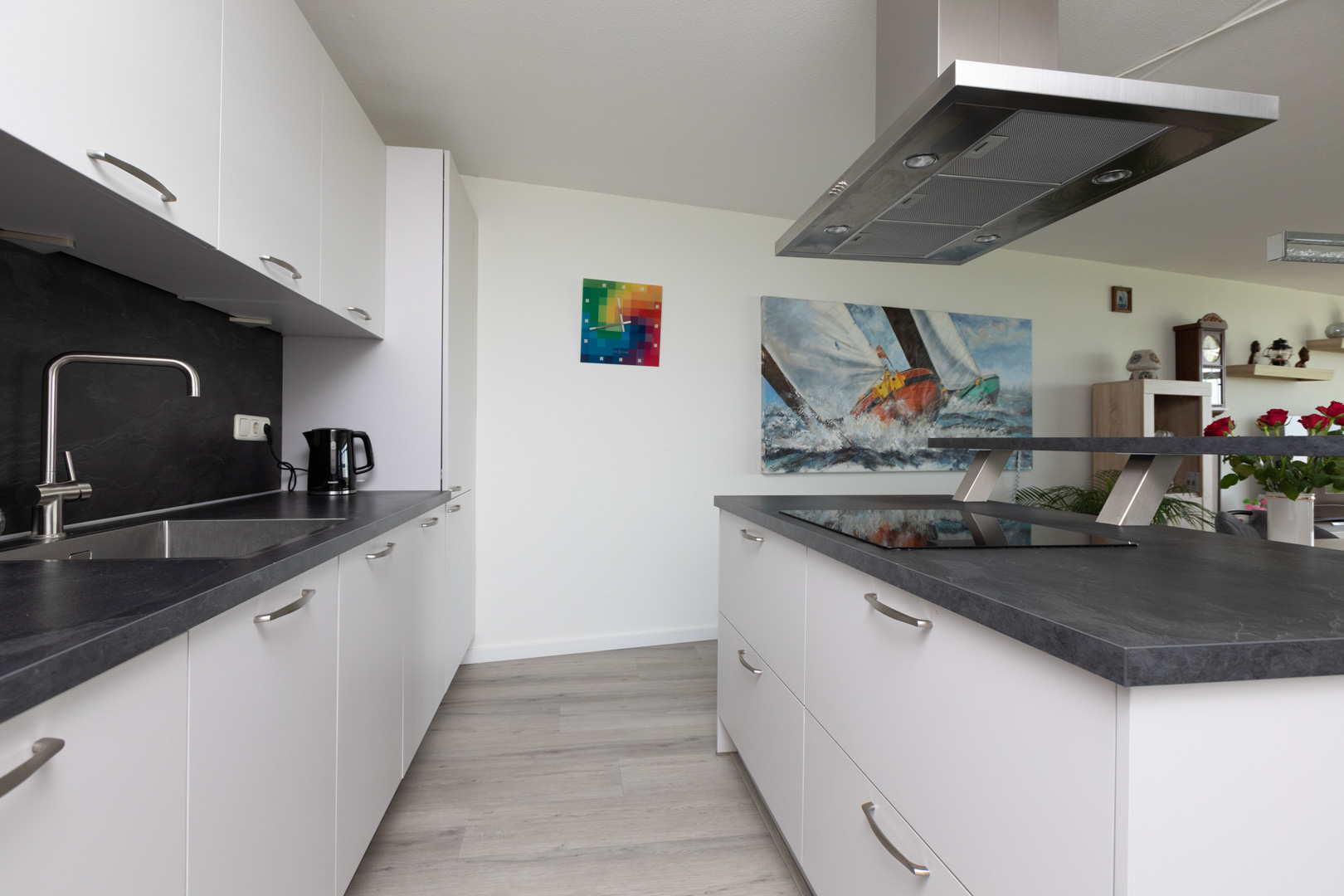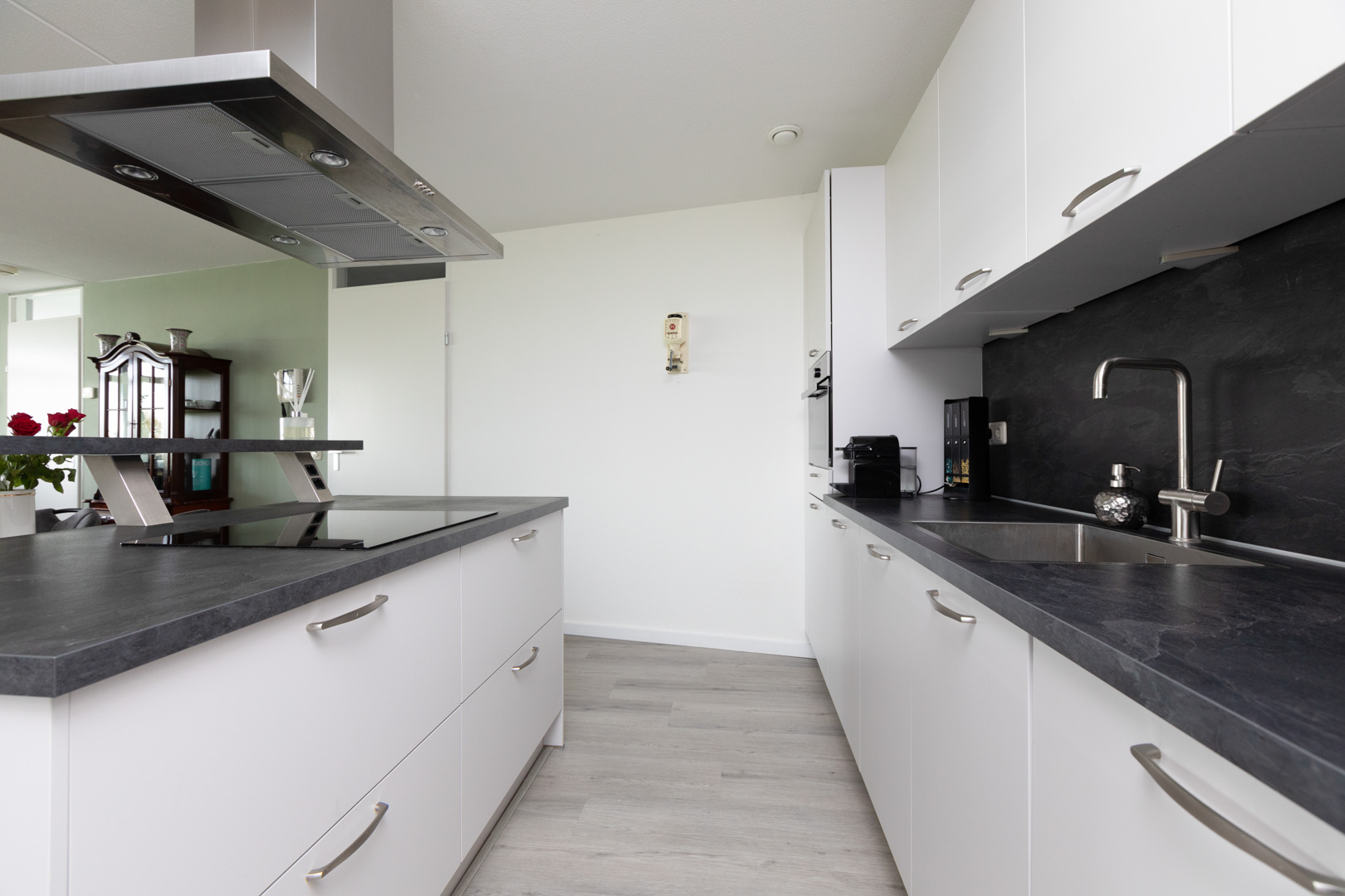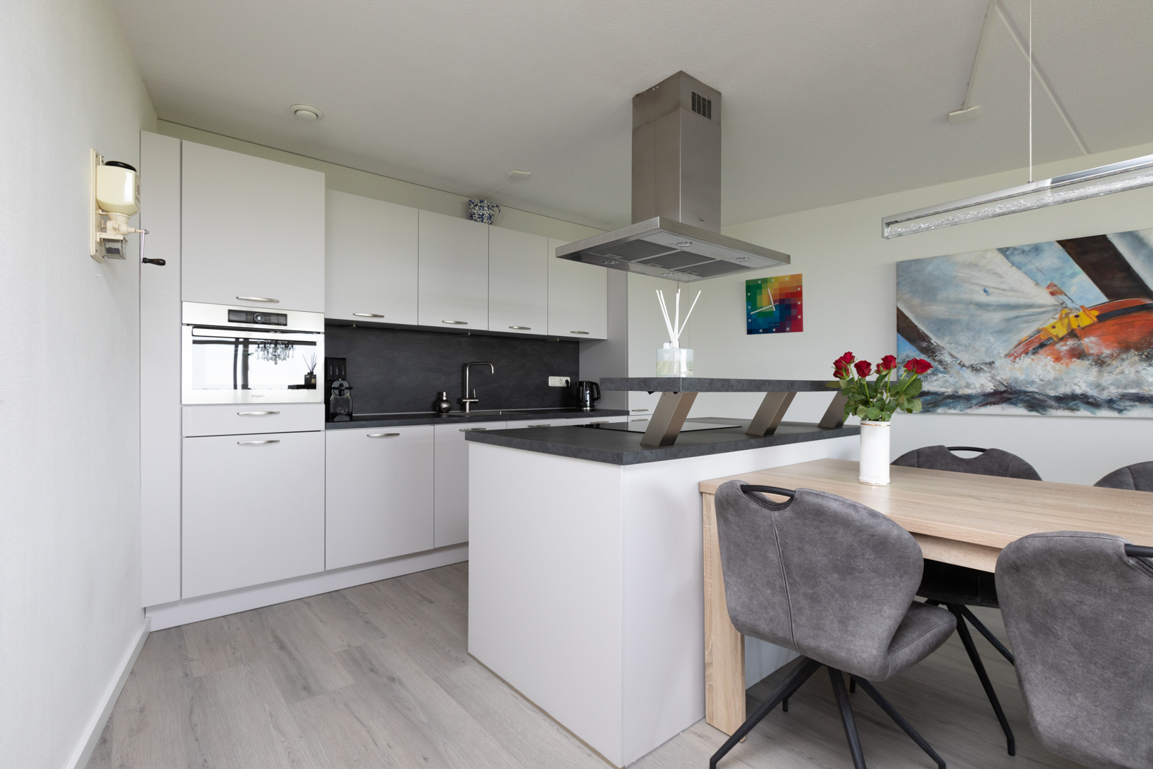 Entree. Ruime hal met moderne laminaatvloer. Wc ingericht met wandcloset en fonteintje. Riante woonkamer (ca. 48m2) met uitstekende lichtinval, moderne laminaatvloer en open keuken, vernieuwd in 2020, voorzien van moderne inrichting met kookeiland en diverse inbouwapparatuur (vaatwasmachine, combi-oven, koel-/vriescombinatie, eilandschouw en inductie kookplaat). Twee ruime slaapkamers (ca. 8 en 14m2) waarvan één met schuifpui naar het balkon (zuid). Volledig betegelde moderne badkamer (ca. 7m2), vernieuwd in 2020, ingericht met inloopdouche, wastafelmeubel en designradiator. Was-/cv-ruimte met aansluiting wm/wd en opstelling cv-combiketel (2024).