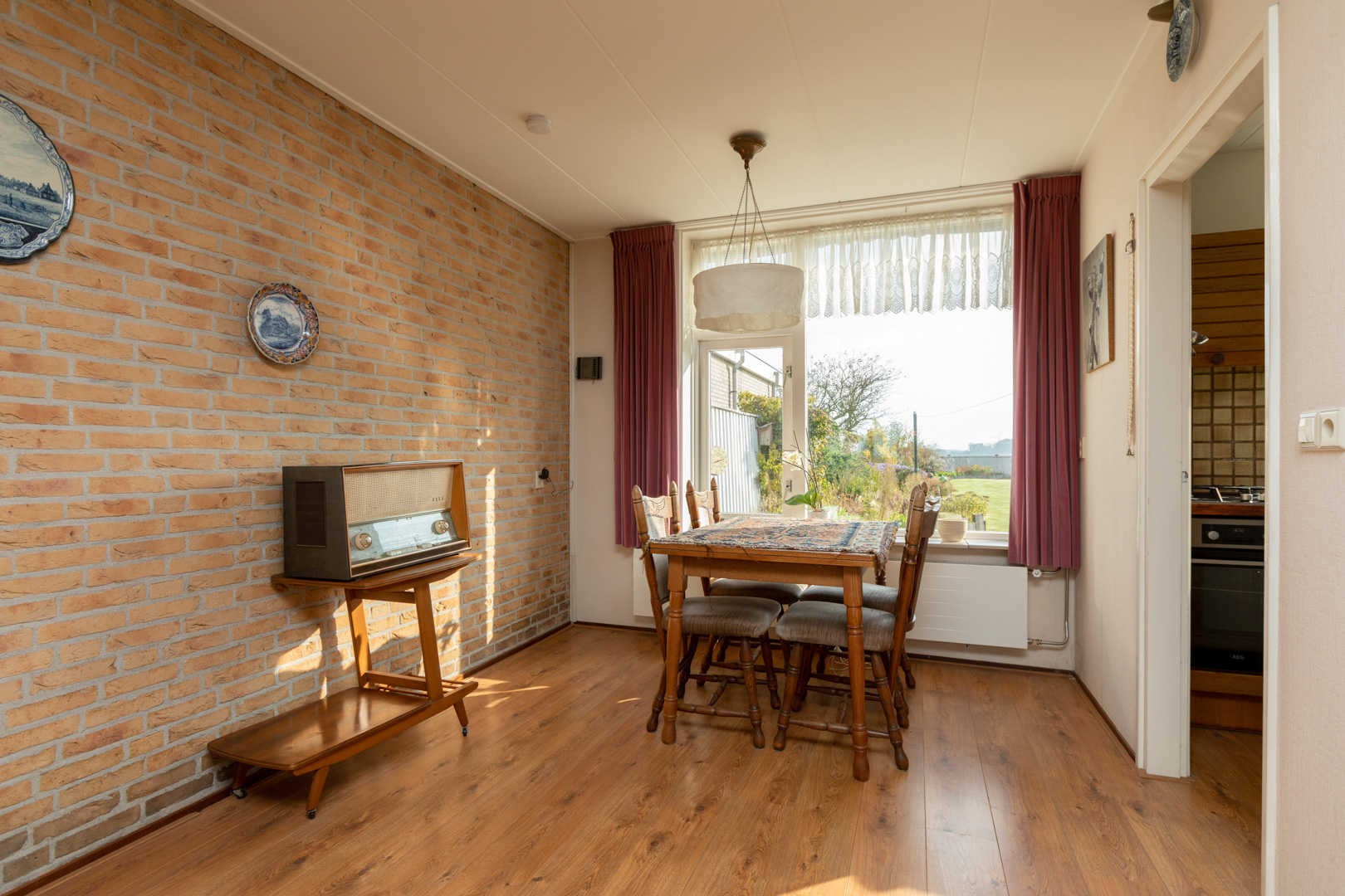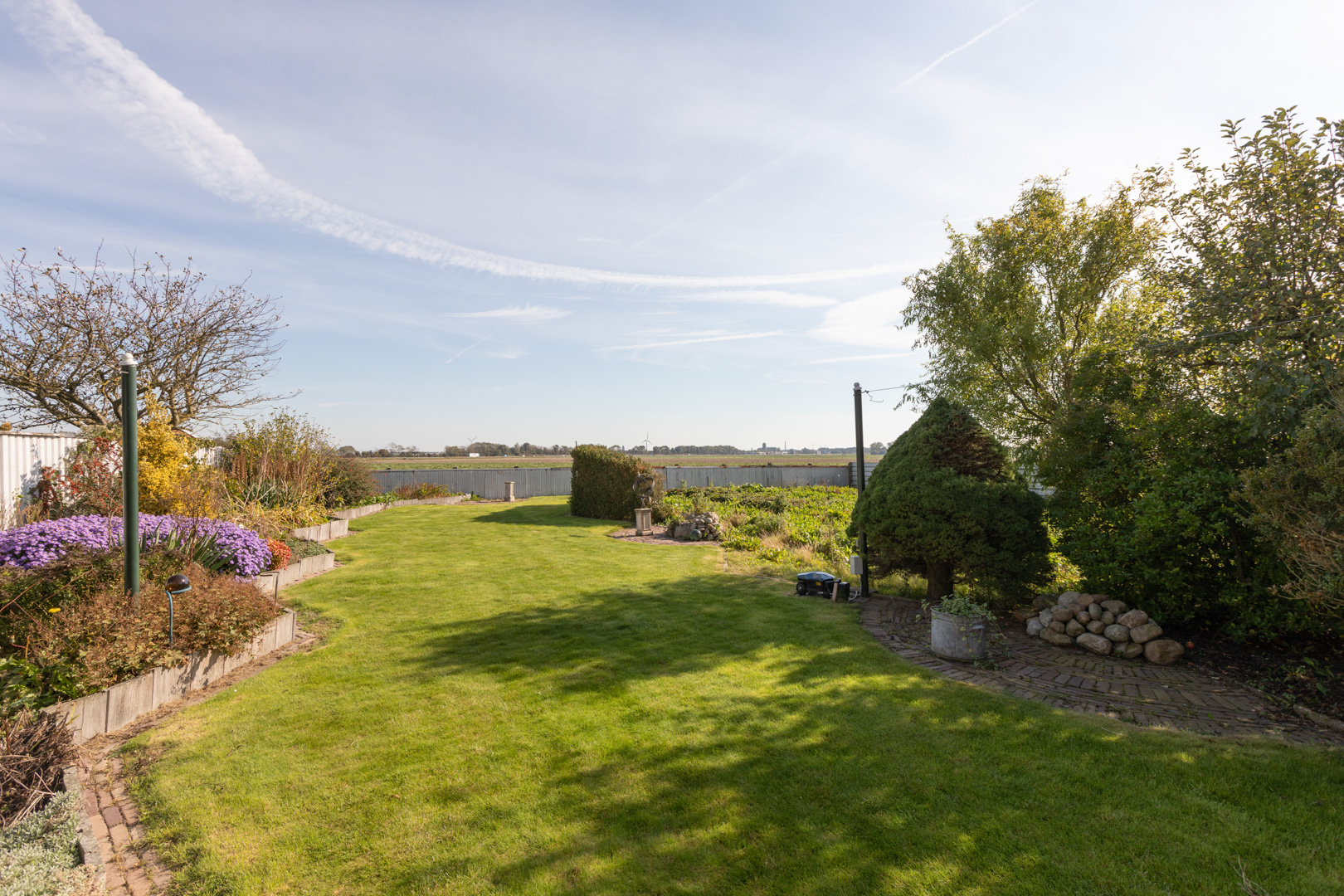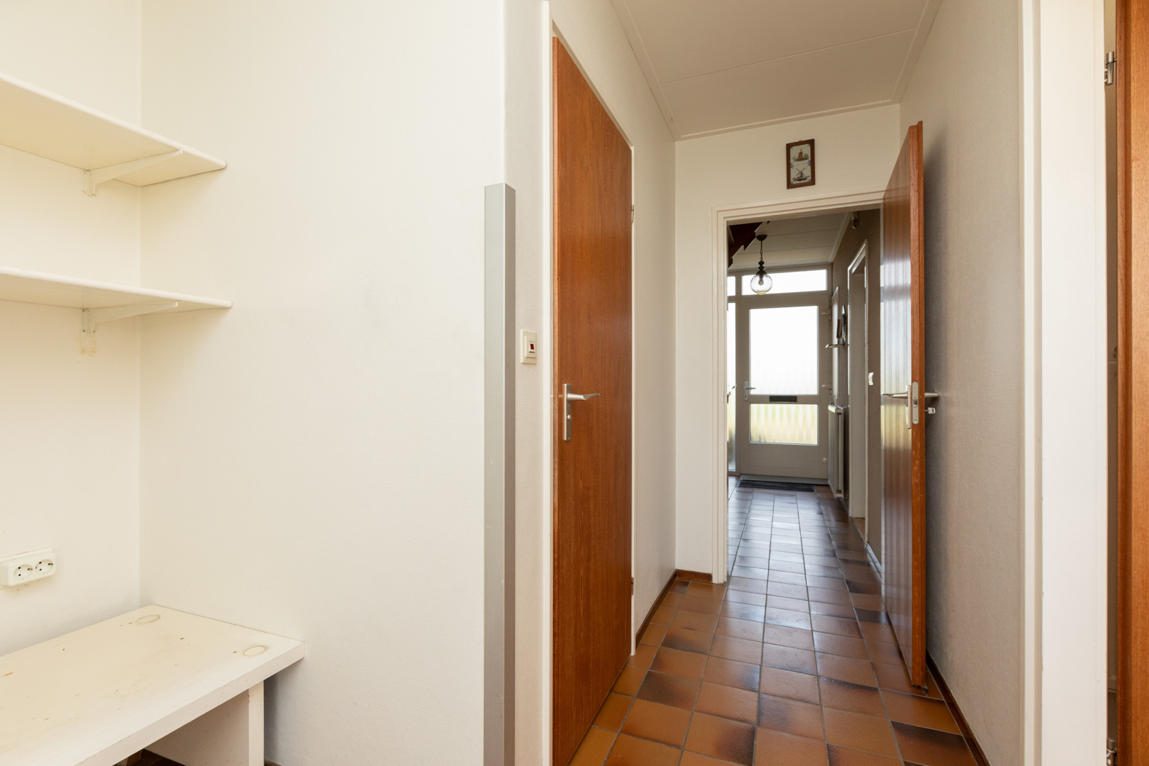 Ruime entree/hal (ca. 9m2) met kunststof voordeurpui, tegelvloer, wc met fonteintje, meterkast (6 gr.) en een open trapopgang. Ruime L-woonkamer (ca. 32m2) met aan de voor- en achterzijde landelijk uitzicht. De woonkamer is voorzien van een laminaatvloer en een haardpartij met houtkachel. Dichte keuken (ca. 8m2) met twee provisiekasten en passende inrichting met enige inbouwapparatuur. Wasruimte/bijkeuken (ca. 6m2) met tegelvloer, wasmachine aansluiting, opstelling van de cv-combiketel en deur naar de tuin. Betegelde badkamer (ca. 2m2) met douche en wastafel. Grote zonnige tuin (ca. 27m x 20m) met groot zonneterras, moestuin, borders en gazon. Buitenkraan. Open schuur t.b.v. tuingereedschap. Grote garage/schuur (ca. 45m2), gedeeltelijk met vliering, met elektrische sectionaaldeur. Ruime oprit voor het parkeren van meerdere auto's. Aangelegde voortuin.