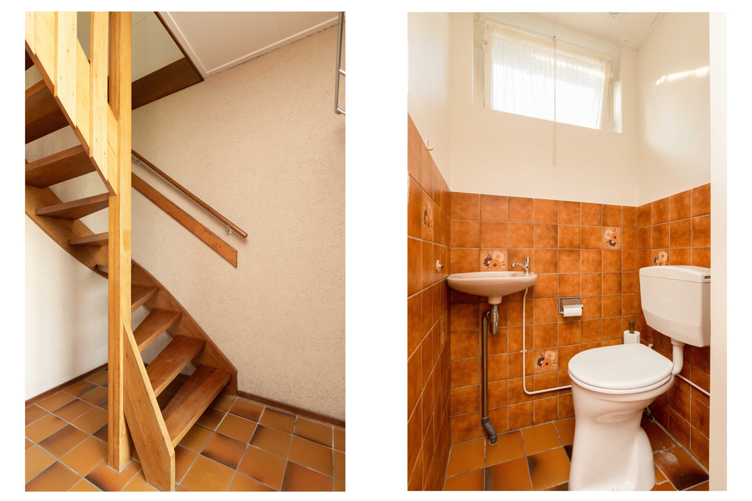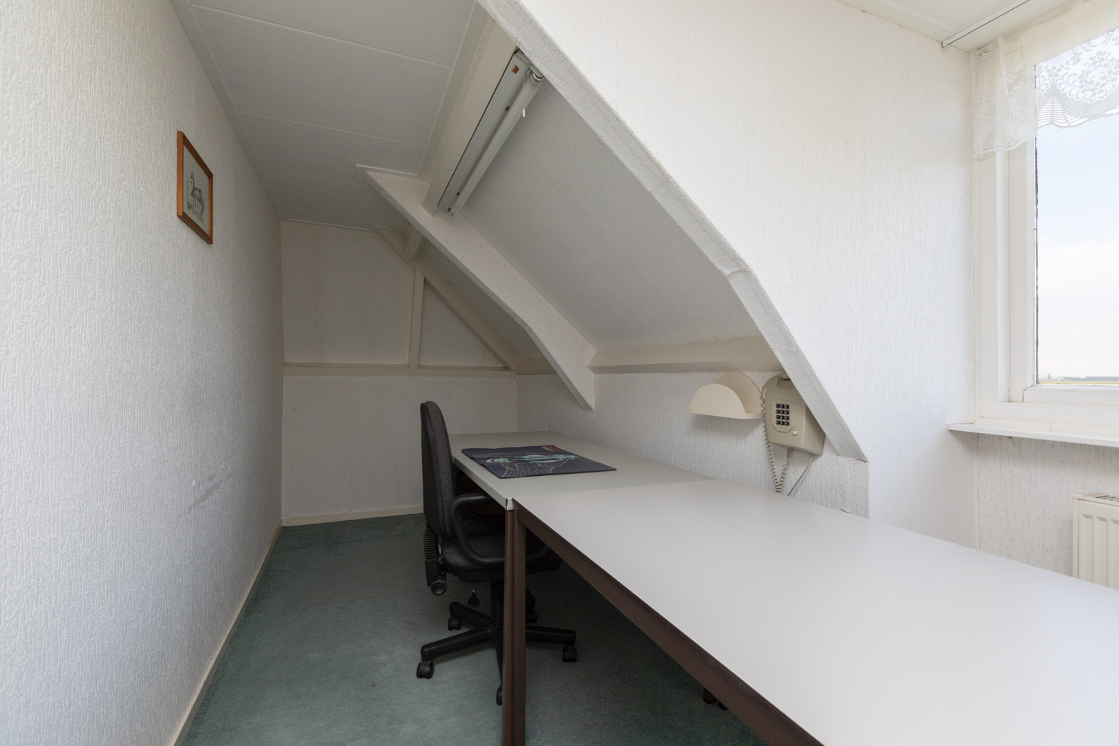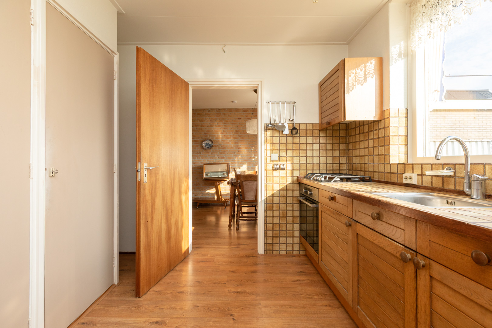 Ruime entree/hal (ca. 9m2) met kunststof voordeurpui, tegelvloer, wc met fonteintje, meterkast (6 gr.) en een open trapopgang. Ruime L-woonkamer (ca. 32m2) met aan de voor- en achterzijde landelijk uitzicht. De woonkamer is voorzien van een laminaatvloer en een haardpartij met houtkachel. Dichte keuken (ca. 8m2) met twee provisiekasten en passende inrichting met enige inbouwapparatuur. Wasruimte/bijkeuken (ca. 6m2) met tegelvloer, wasmachine aansluiting, opstelling van de cv-combiketel en deur naar de tuin. Betegelde badkamer (ca. 2m2) met douche en wastafel. Grote zonnige tuin (ca. 27m x 20m) met groot zonneterras, moestuin, borders en gazon. Buitenkraan. Open schuur t.b.v. tuingereedschap. Grote garage/schuur (ca. 45m2), gedeeltelijk met vliering, met elektrische sectionaaldeur. Ruime oprit voor het parkeren van meerdere auto's. Aangelegde voortuin.