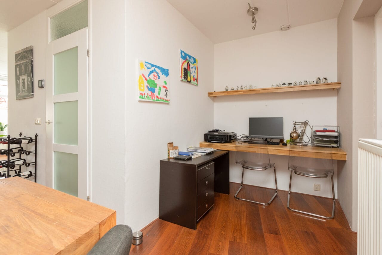 Overloop. Twee grote slaapkamers (ca. 12, 9m2). Hobby-/werkkamer (ca. 7,5m2) met doorgang naar een riante zit-/slaapkamer (ca. 24m2). Deze is gesitueerd in de opbouw en heeft een grote inloopkast, een deur naar een plat dak en een vlizotrap naar een vliering. Volledig voorzien van een laminaatvloer. Moderne badkamer, vernieuwd in 2017, ingericht met inloopdouche, wastafelmeubel, 2e toilet (wandcloset), designradiator en een dak-/kantelraam.