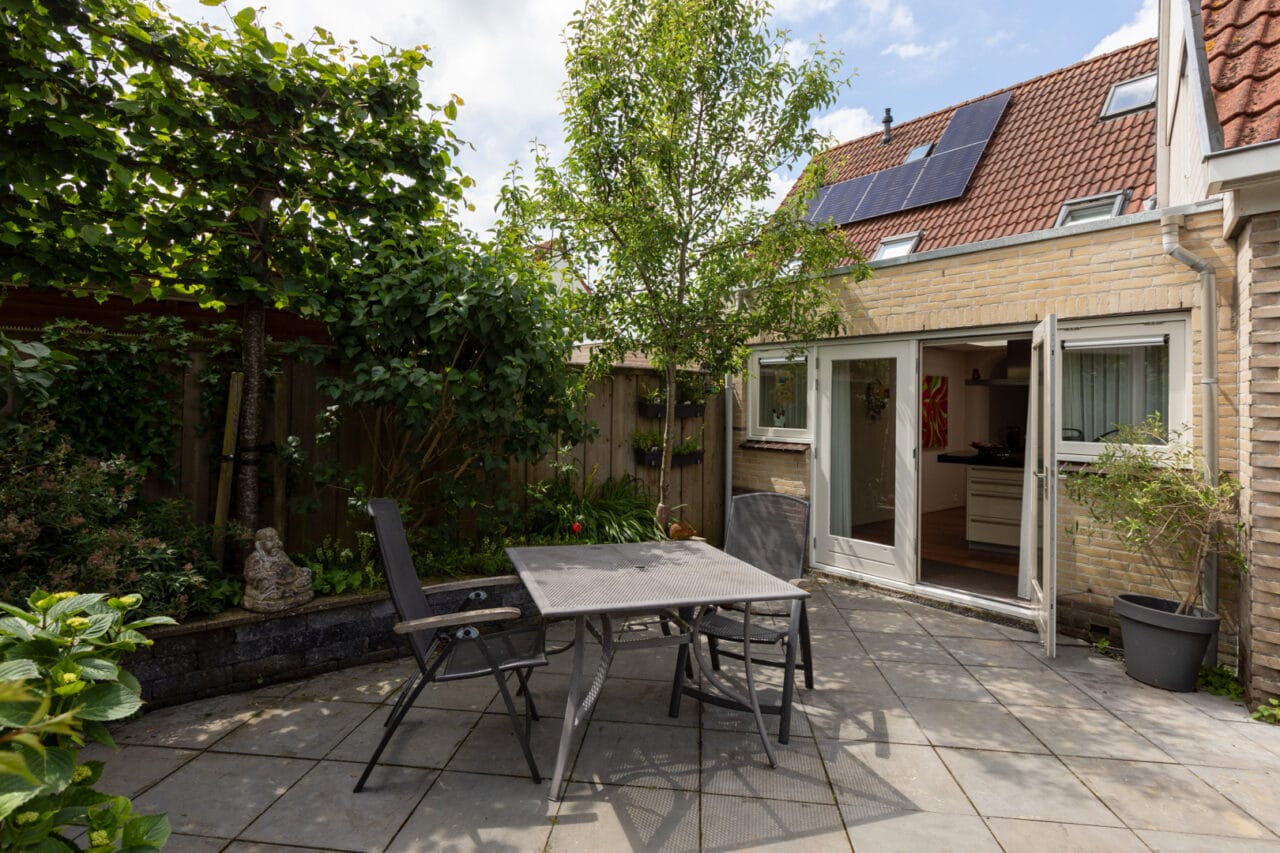 Overdekte entree. Hal. Trapopgang. Meterkast (10 gr./aardlek). Moderne wc Ruime hal. Moderne wc, vernieuwd in 2017, ingericht met wandcloset en fonteintje. Ruime U-woonkamer (ca. 36m2) met laminaatvloer, provisie-/trapkast en werkhoek. Aangebouwde keuken (ca. 16m2) met inrichting in T-opstelling voorzien van een composiet werkblad en diverse inbouwapparatuur (inductie kookplaat, gas wokbrander, koeler, vaatwasmachine, combimagnetron). Brede pui met tuindeuren aan de achterzijde. Inpandige bijkeuken/berging (ca. 6m2) met wasmachine/wasdroger aansluiting en doorgang naar de garage/berging (ca. 25m2). De garage/berging heeft een betonvloer en een elektrische sectionaaldeur. Verzorgde en aangelegde achtertuin, zonnig en met veel privacy. Ingericht met bestrating, borders en een overdekte loungehoek (ca. 12m2). Achterom naast de woning. Onderhoudsvriendelijk en onlangs opnieuw aangelegde voortuin. Oprit t.b.v. het parkeren van auto's.