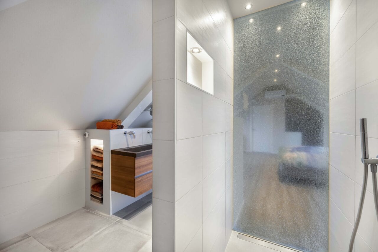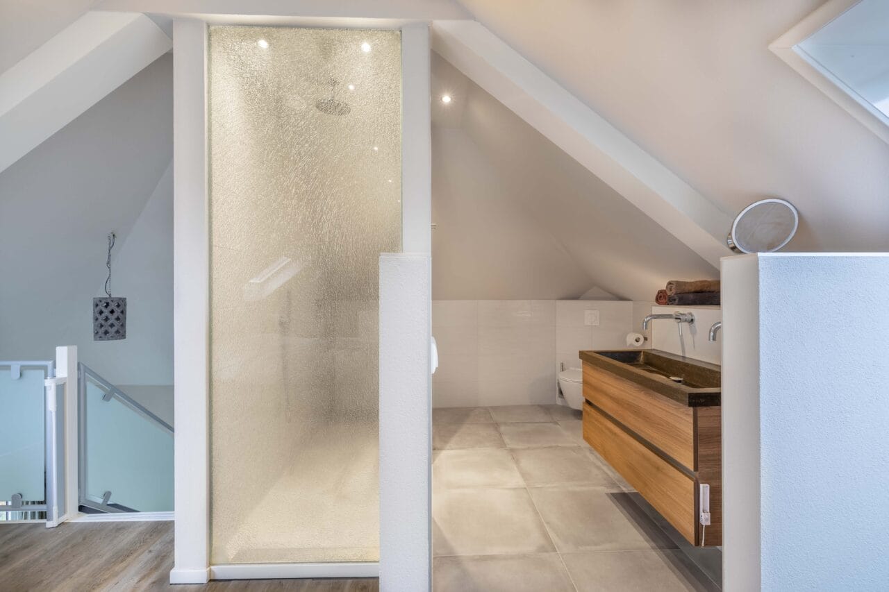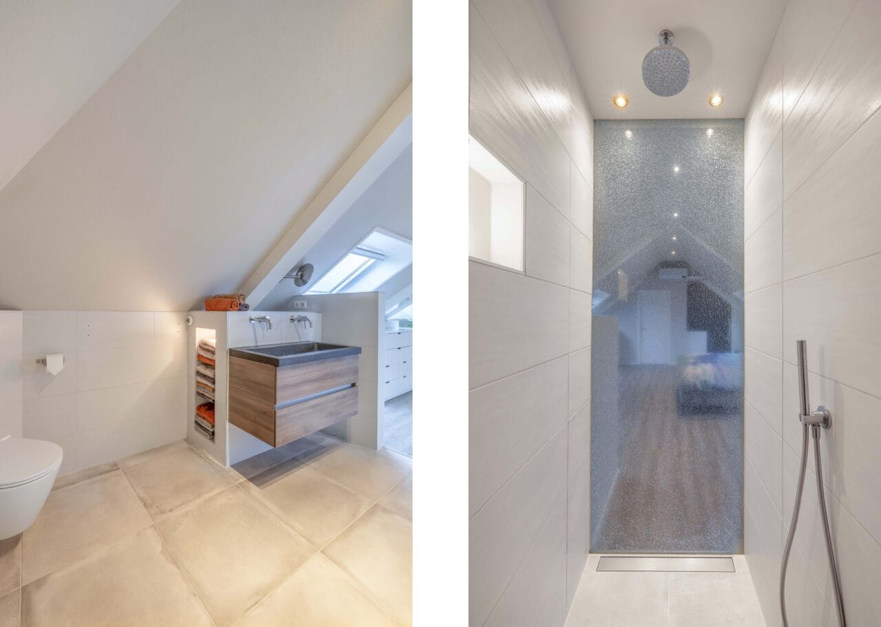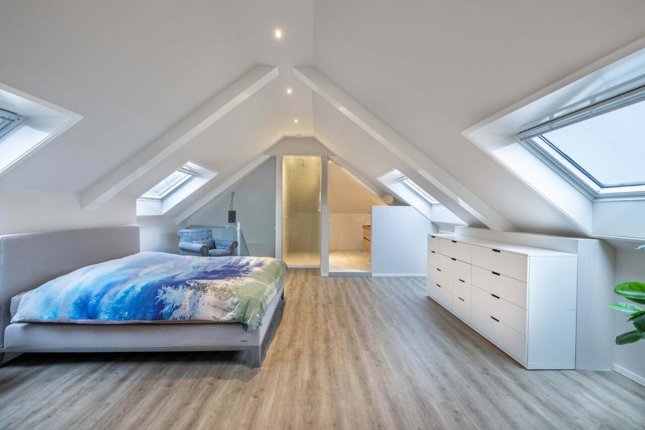 Een ruime verdieping (ca. 48m2) ingericht als een riante master suite. Een lichte sfeervolle ruimte met meerdere dak-/kantelramen, een moderne pvc vloer, een inloopkast/berging en/of kleinere werk-/slaapkamer en een moderne badkamer. Deze is ingericht met een inloopdouche (stortdouche), wastafelmeubel met hardstenen wastafel, geïntegreerde kranen, verwarmde spiegel, een 2e toilet (wandcloset) en vloerverwarming.