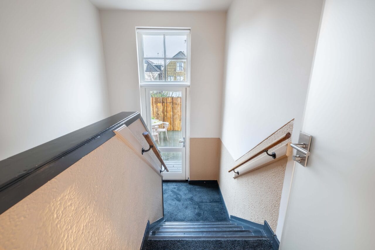 Overdekte entree in het midden van het pand met aansluitend een hal met trapopgang. Aan de rechterzijde van de hal bevindt zich een grote multifunctionele kamer (ca. 33m2), thans in de gebruik als kantoor, met kitchenette, parketvloer, grote pui met deuren naar de tuin en toegang tot een badkamer. De recent gerealiseerde badkamer is uitgerust met een douche, wastafelmeubel en wc (wandcloset) en is tevens vanuit de hal bereikbaar. Aan de linkerzijde van de hal bevinden zich thans twee (slaap)kamers waarvan één (ca. 15m2) aan de voorzijde van het pand één (ca. 18m2) aan de tuinzijde van het pand. Beide slaapkamers zijn voorzien van een pvc vloer in lichte kleurstelling. De slaapkamer aan de tuinzijde heeft een grote pui met met deuren naar de tuin en een berging met mogelijkheid voor een badkamer. Kast met cv-ketel t.b.v. de verwarming van de begane grond. Trapkast met opstelling van de waterontharder. Vanuit de hal is een tuindeur met toegang tot een overdekt terras. De achtertuin (ca. 10x11m) is stijlvol aangelegd met meerdere zitplekken, verlichting, borders en een vrijstaande berging (ca. 11m2). Volledige privacy en de hele dag zon maken deze stadstuin een echte buitenkamer.
