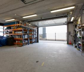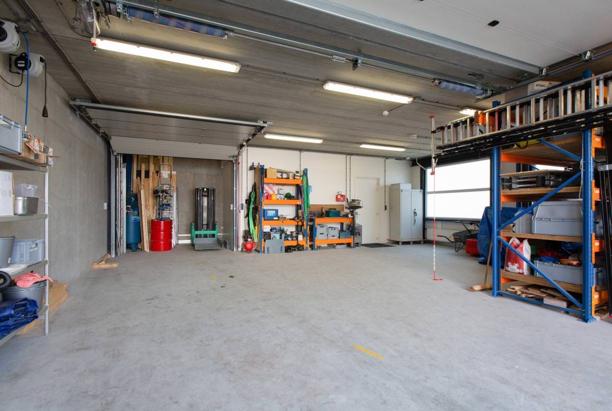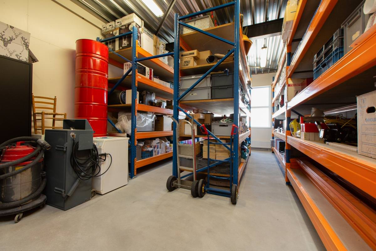 Ruime hal/entree voorzien van systeemplafond met verlichting, uitgebreide meterkast, trapopgang, volledig betegeld toilet (wandcloset) met wastafelmeubel. Opslag/werkplaats ca. 102 m2 met elektrische overheaddeur met afstandbediening. Via een speciale uitsparing in het plafond kan vanaf de begane grond met een hefinstallatie de verdieping als extra opslagruimte gebruikt worden.