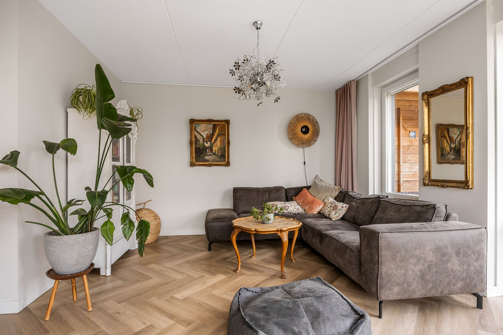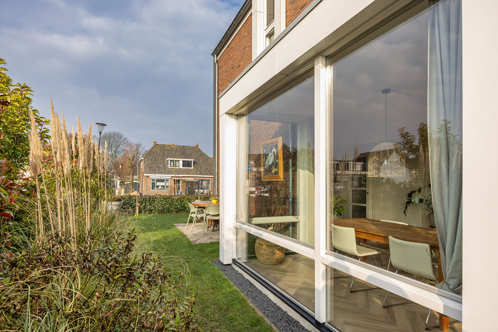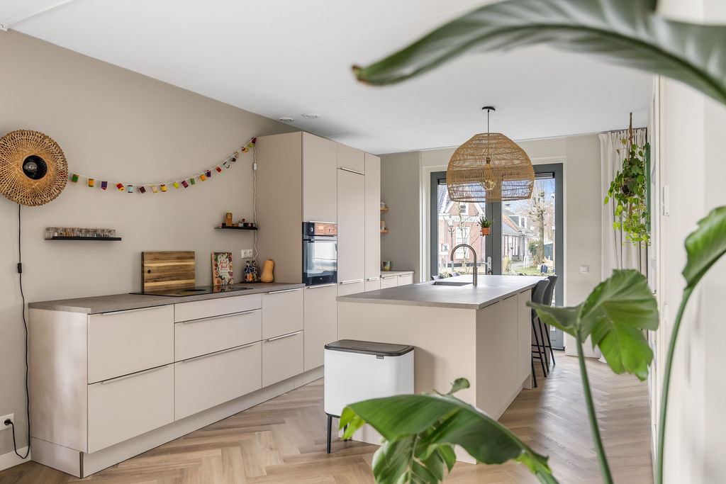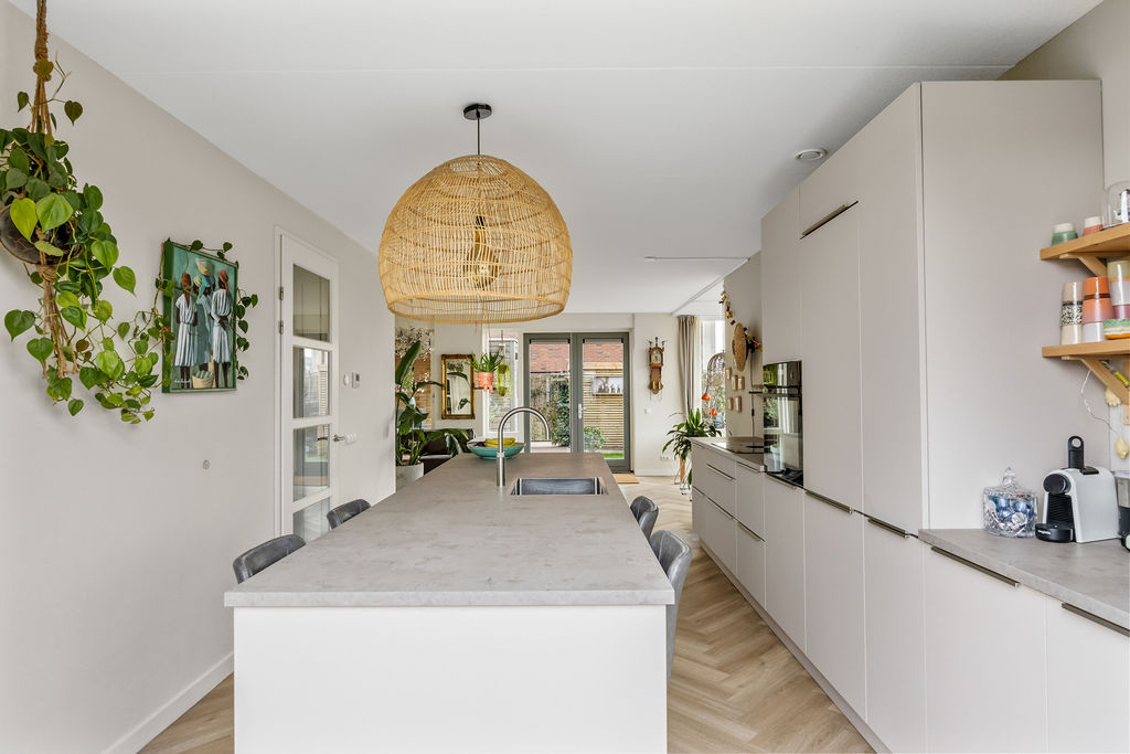 Ruime entree/hal. Meterkast (11 gr./inclusief koken/aardlek). Moderne wc ingericht met wandcloset en fonteintje. Trapopgang. Ruime trap-/provisiekast. Ruime en heerlijk lichte, speels ingedeelde, living (ca. 48m2) met moderne visgraat pvc vloer met vloerverwarming, strakke wand- en plafondafwerking, openslaande deuren naar de voor- en achtertuin en een brede erker opzij. In de living bevindt zich de open keuken. Deze is voorzien van een moderne inrichting (2023) met een spoeleiland en diverse (AEG) inbouwapparatuur (BORA inductiekookplaat met geïntegreerde afzuiging, combimagnetron, Quooker, vaatwasmachine, koel-/vriescombinatie). Vanuit de woonkamer en keuken geniet u een vrij uitzicht over het water. Aangelegde tuin aan de achterzijde (oost), zijkant (zuid) en voorzijde (west), passend ingericht en extra vrij gelegen door het hoekperceel! De tuin heeft diverse terrassen met privacy, zicht, zon en schaduw. Verder zijn er veel vaste planten, gazon, Oud Hollandsche tegels en een loungehoek (ca. 8m2), met lichtkoepel, om tot in de late uren van het buitenleven te genieten. Aangrenzend een ruime berging (ca. 5m2) en overkapping t.b.v. fietsen.