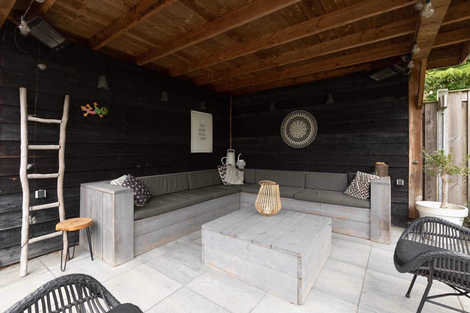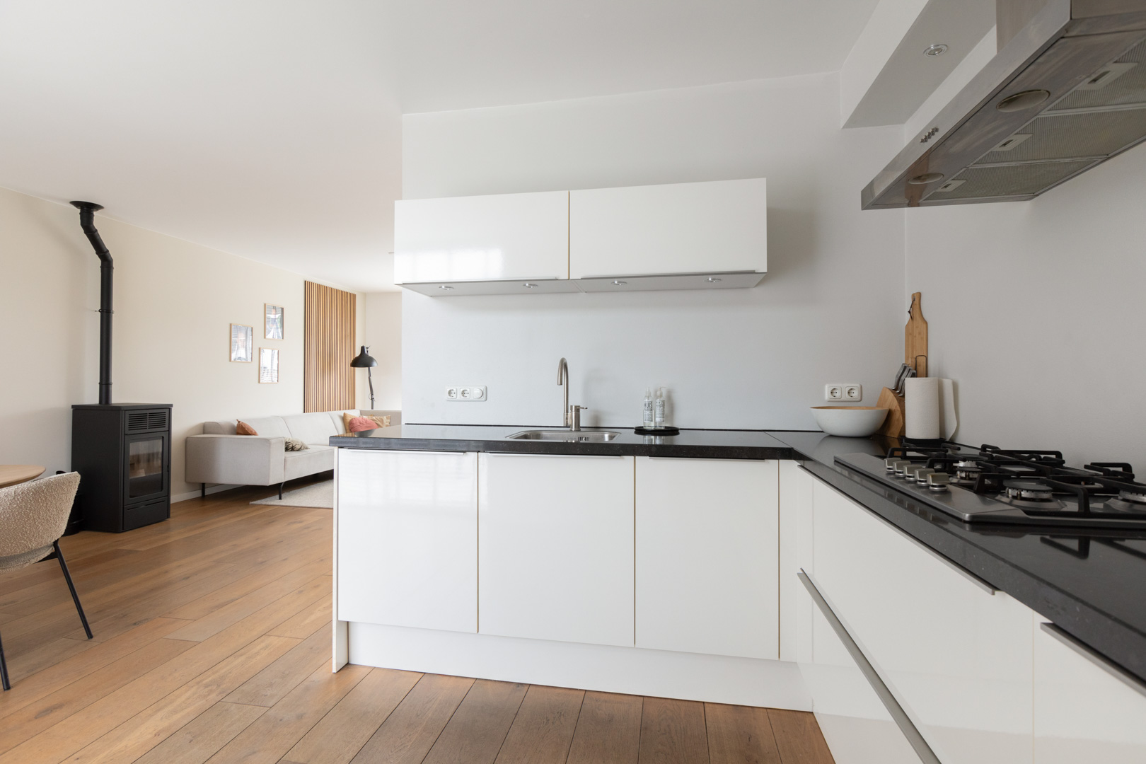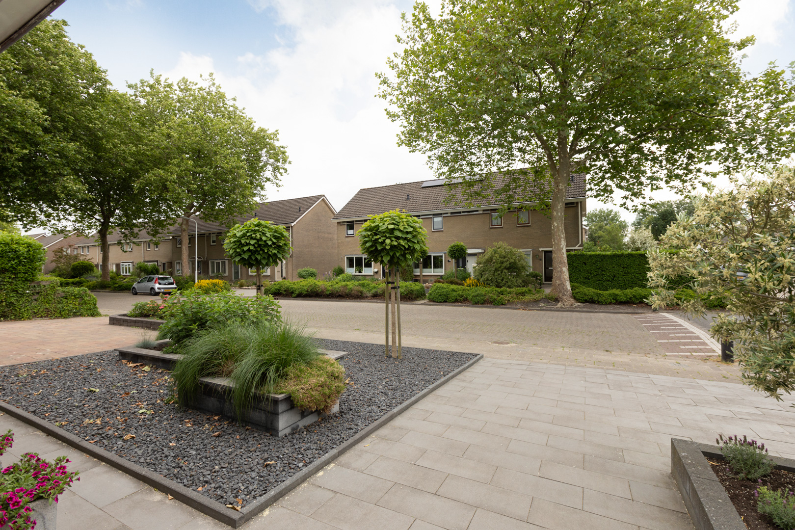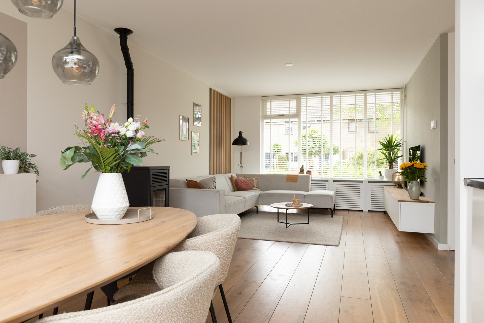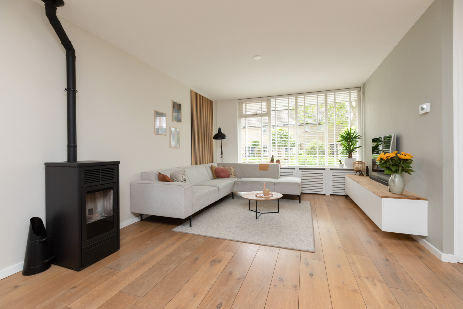 Ruime entree/hal. Meterkast (8 gr./pv groep/aardlek). Moderne wc ingericht met wandcloset en fonteintje. Trapopgang met eiken trapbekleding. Ruime en heerlijk lichte doorzonkamer (ca. 33m2) met massief eiken vloer, aansluiting voor een kachel en een schuifpui naar de tuin. Provisie-/trapkast. Open keuken (ca. 8m2) met moderne inrichting (2014) in hoekopstelling met een werkblad van composiet en inbouwapparatuur (5 pits gaskookplaat, afzuigkap, vaatwasmachine, koeler, combi-oven). Aangebouwde bijkeuken met tegelvloer, wasmachine/wasdroger aansluiting en deur naar de tuin en naar de garage/berging. De ruime garage/berging (ca. 7.35x3.01m) is thans in gebruik als ruime berging met deur aan de voorzijde en kanteldeur aan de achterzijde. De garage is voorzien van een betonvloer. Mogelijkheid voor oprit aan de achterzijde en toegang vanaf het plein. Vrij gelegen en zeer verzorgde achtertuin op het zonnige westen. De tuin is ingericht met terrassen, bestrating, borders, gazon en overdekte loungehoek (ca. 3.30x 3.85m). Elektra en buitenkraan. De voortuin is passend en modern aangelegd. Deur naar de garage/berging.