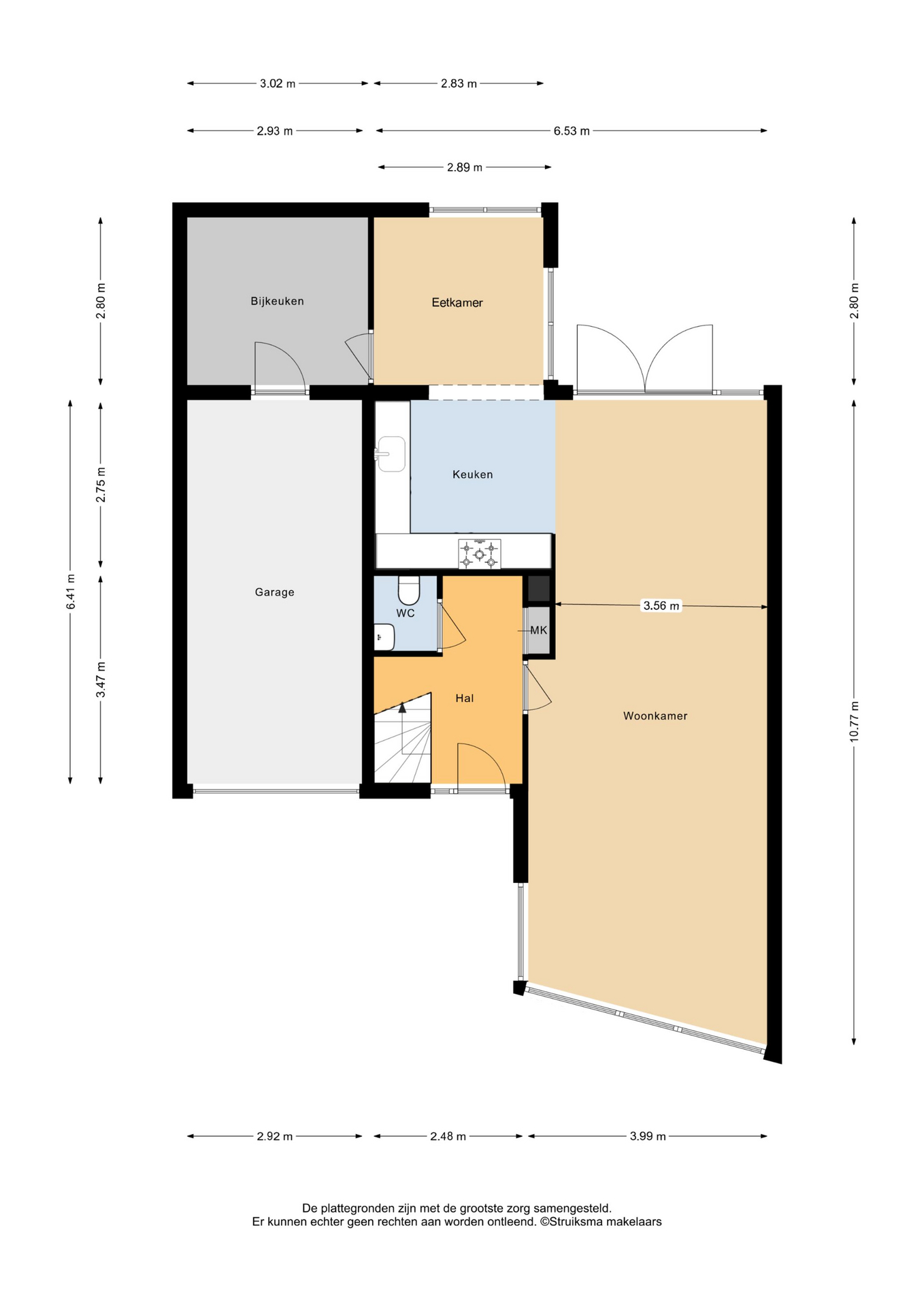 Ruime hal (ca. 7m2). Open trapopgang. Meterkast (8 gr./aardlek). WC met fonteintje. Ruime (ca. 39m2) woonkamer met uitstekende lichtinval, plavuizen met vloerverwarming en openslaande deuren naar de achtertuin. Open keuken (ca. 9m2) met inrichting in hoekopstelling voorzien van inbouwapparatuur (combimagnetron, koeler, 4 pits gaskookplaat en afzuigkap). Aangebouwde tuin-/eetkamer (ca. 8m2), ideaal als thuiswerkplek of speelkamer voor kinderen. Bijkeuken/berging (ca. 9m2) met doorgang naar de grote garage (ca. 19m2). In de garage is een wasmachine aansluiting aanwezig. Grote zonnige tuin (ca. 10x12m) op het westen, met tuinberging, gazon en bestrating. Achterom naast de woning. Ruime voortuin en oprit met parkeergelegenheid op eigen erf.