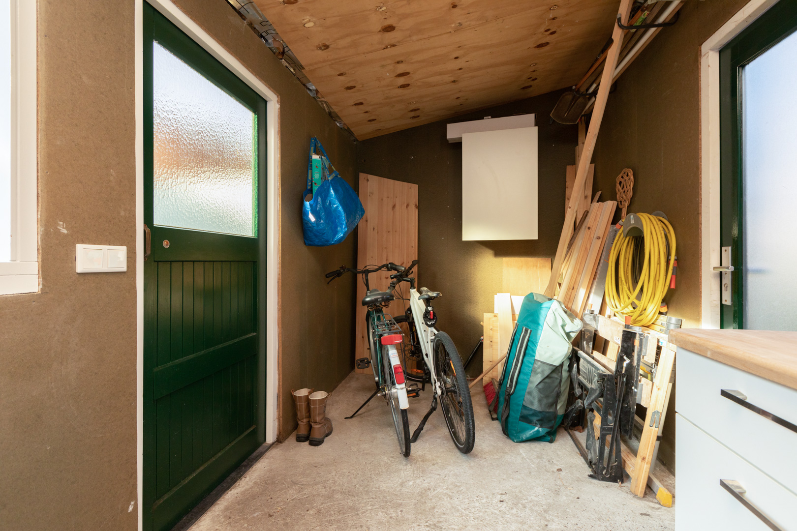 Entree/gang met nieuwe voordeur (2023). Meterkast (7 gr./kookgroep/aardlek). Gezellige woonkamer (ca. 21m2) met houten dekvloer, balkenplafond en een schouw met gas aansluiting. Fraai glas-in-lood raam tussen gang en woonkamer. Werk-/hobbykamer (ca. 8m2) met houten dekvloer, balkenplafond, vaste kasten en trapopgang. Ruime en ruimtelijke keuken (ca. 9m2) met houten dekvloer, moderne in 2022 vernieuwd inrichting met inbouwapparatuur (inductie kookplaat, zwevende afzuigkap, vaatwasmachine, oven, combimagnetron, koel-/vriescombinatie). Bijkeuken/wasruimte (ca. 4m2) met wasmachine/wasdroger aansluiting, opstelling van de cv-combiketel en deur naar de tuin. Moderne wc ingericht met wandcloset en fonteintje. Heerlijk vrije en zonnige stadstuin op het zuidoosten ingericht met bestrating/terras, gazon en grote border. Ruime berging (ca. 12m2) met betonvloer, wand- en vloerisolatie, elektra, afdak voor containers en een deur naar de steeg/achterom.