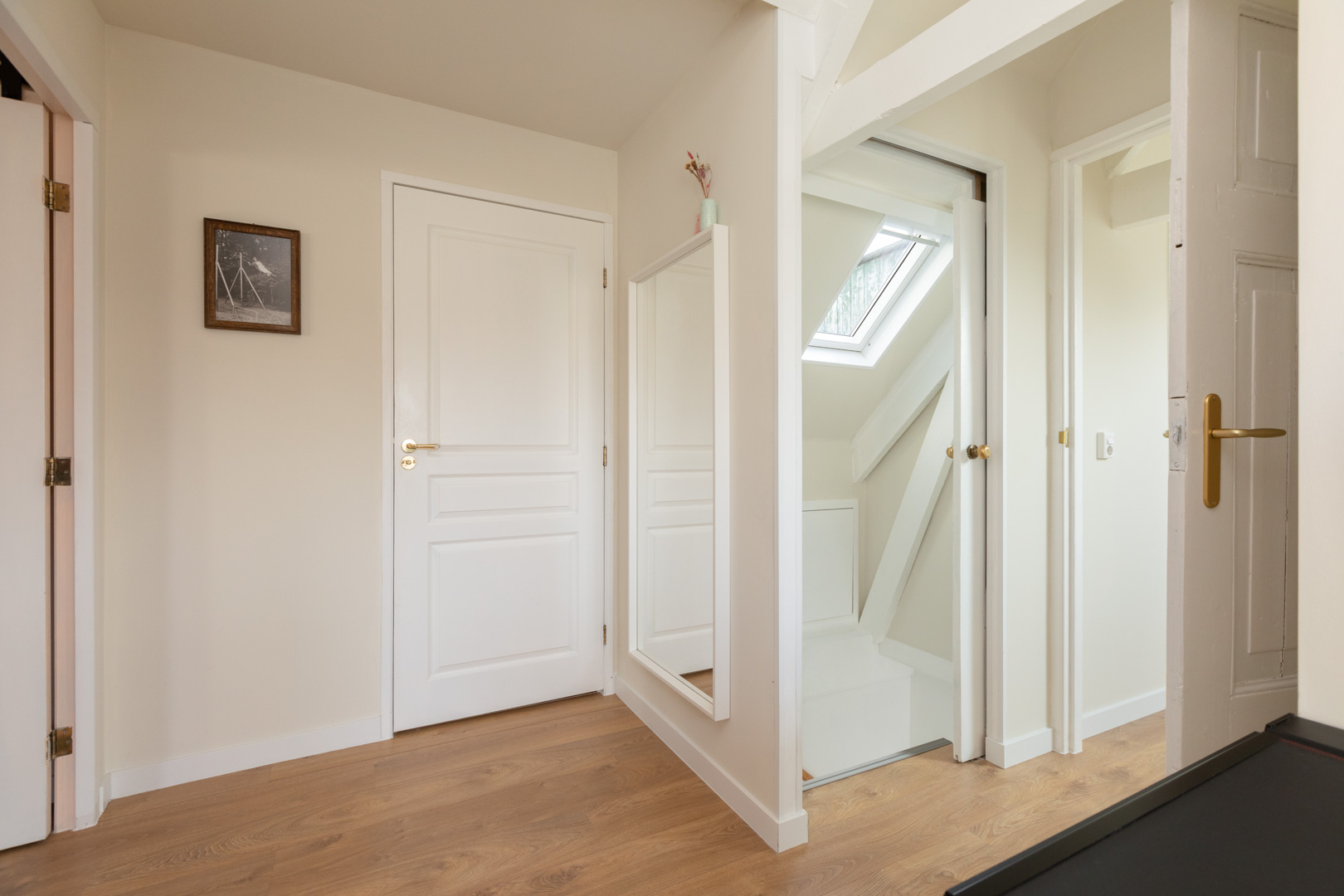 Trapopgang met schuifdeur. Ruime overloop/werkplek met dakkapel, met brede vensterbank, aan de voorzijde, berging en dak-/kantelraam aan de achterzijde. Slaapkamer met groot dak-/kantelraam (2024) aan de voorzijde en vaste kast. Grote en ruimtelijke slaapkamer met twee grote dak-/kantelramen (voor- en achterzijde), schuifdeur naar grote inloopkast. Moderne badkamer, vernieuwd in 2023, ingericht met inloopdouche, met scherm, regendouche en handdouche, wastafelmeubel met plateau, 2e toilet (wandcloset) en een terrazzo vloertegel. De verdieping is voorzien van een moderne laminaatvloer.