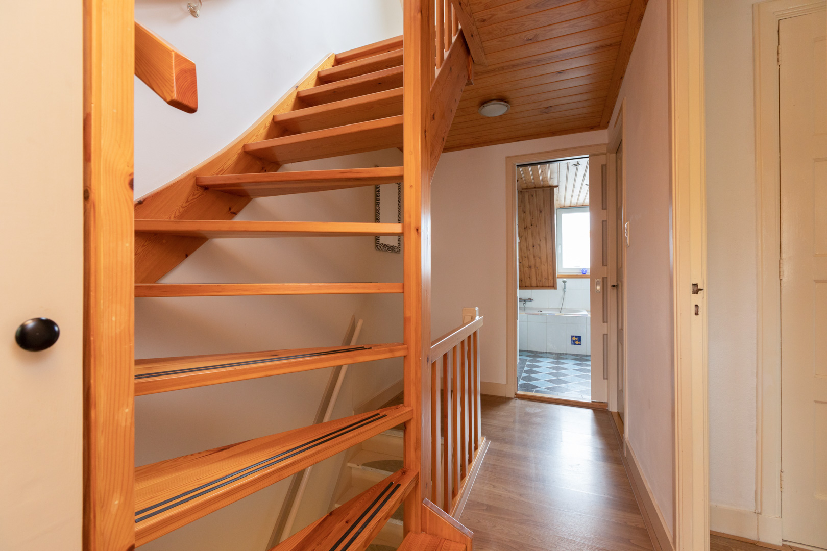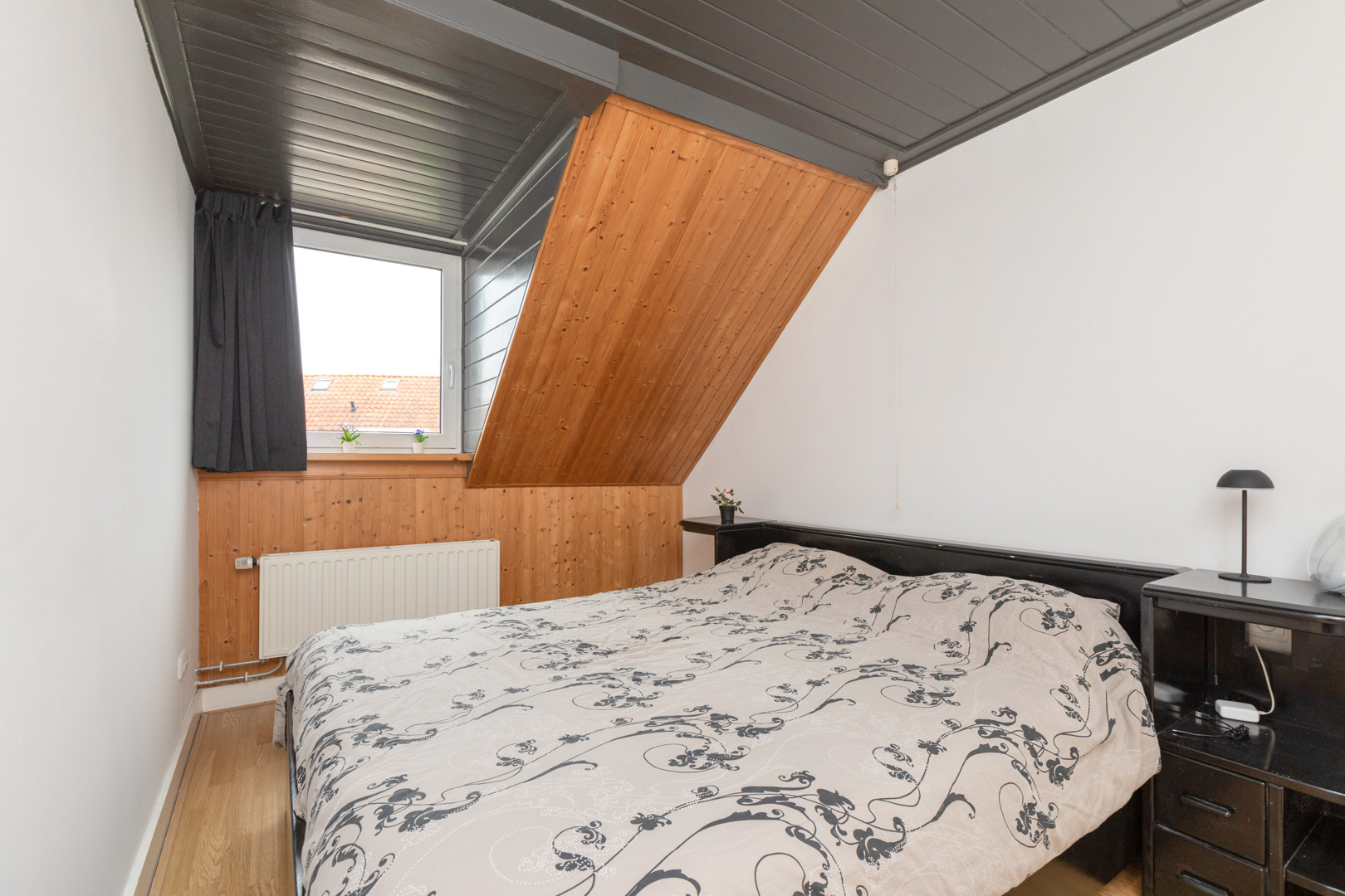 Vaste trap. Zolderkamer (ca. 9m2) met twee dak-/kantelramen, laminaatvloer, inbouwverlichting en berging, achter knieschotten.