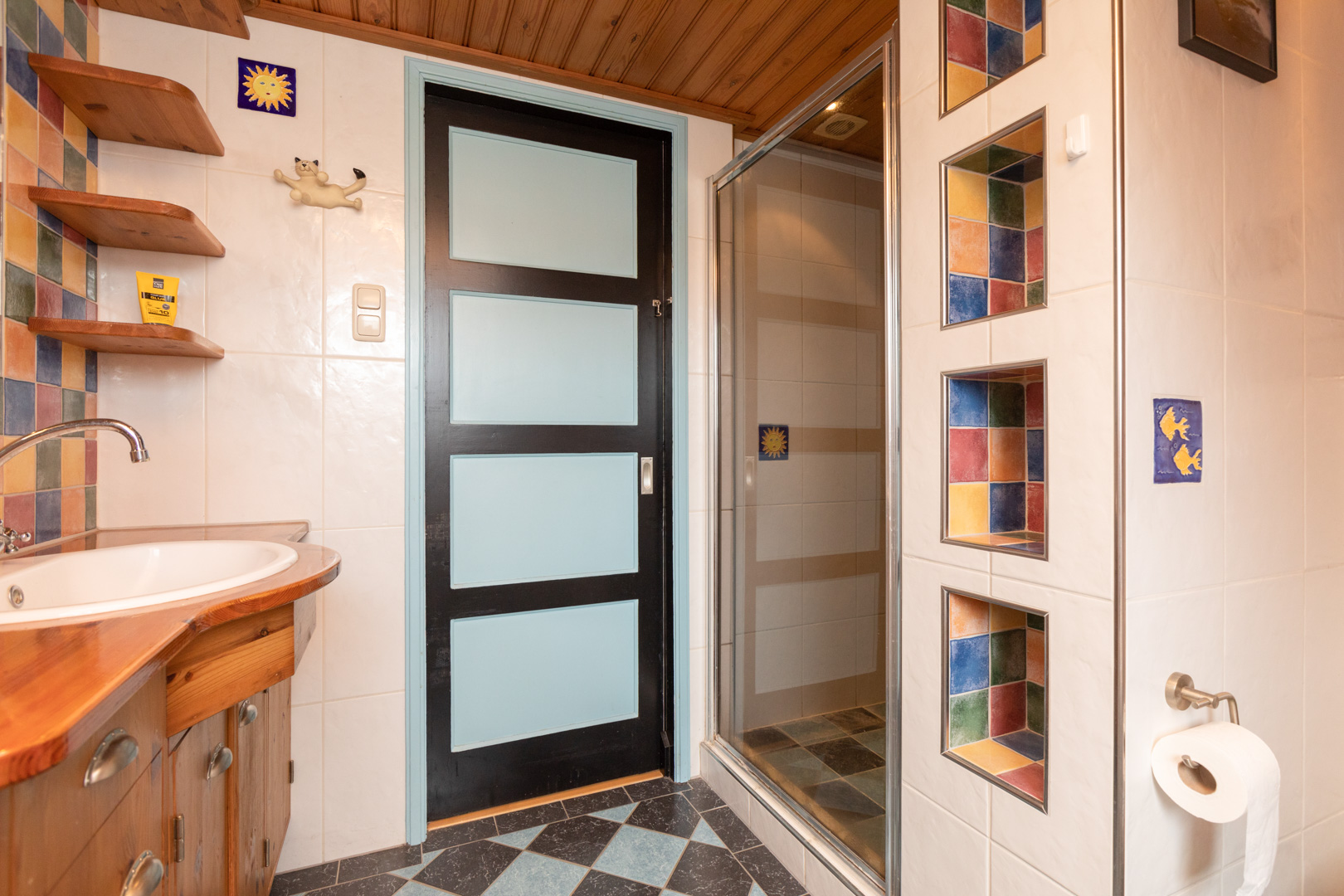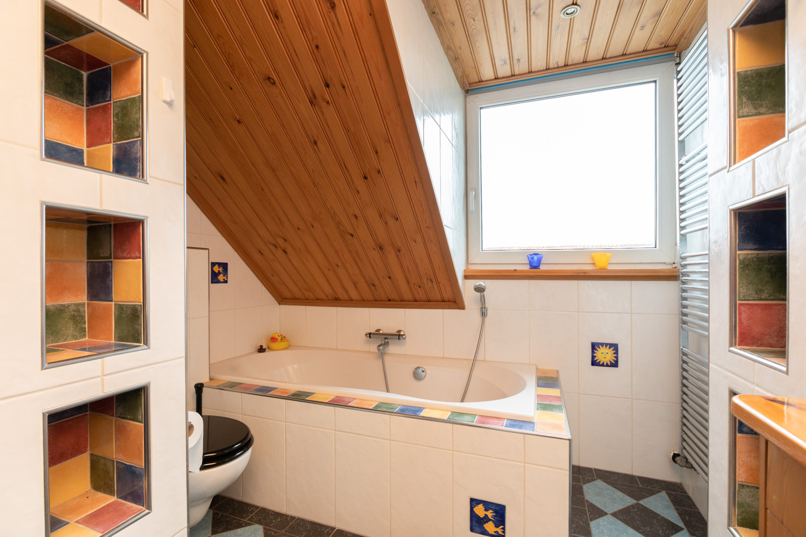 Ruime overloop met laminaatvloer en vaste kast. Twee grote slaapkamers met laminaatvloer en vaste kasten. Dakkapel aan de voor- en achterzijde. Ruime badkamer (ca. 6m2) ingericht met ligbad, douche, wastafelmeubel, 2e toilet (wandcloset) en plafond met inbouwverlichting.