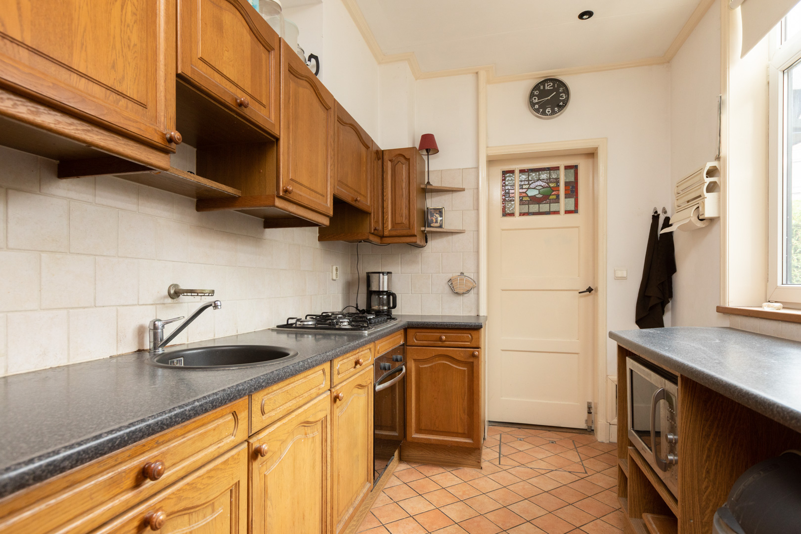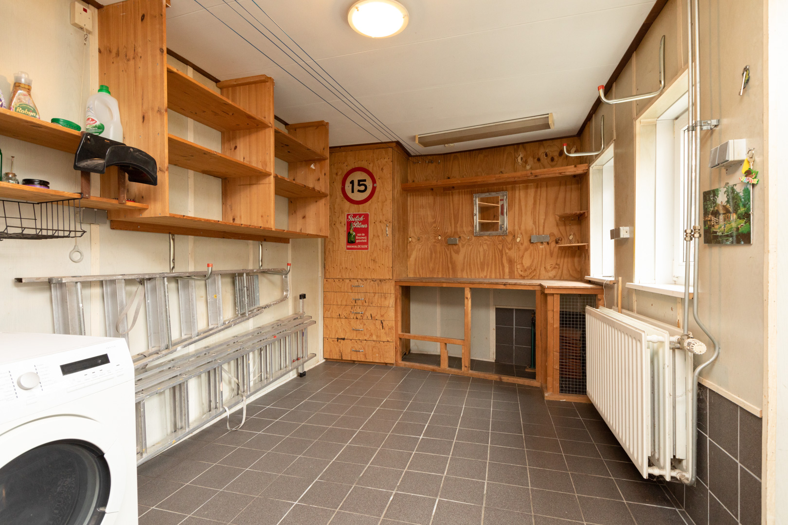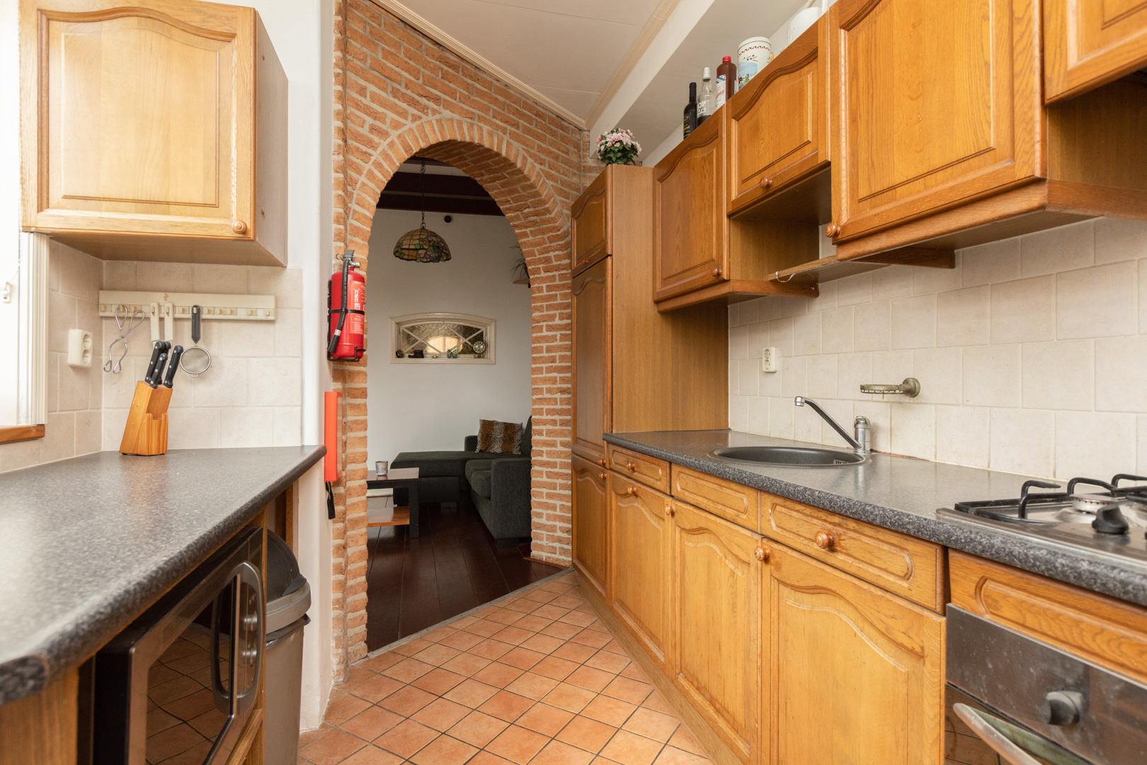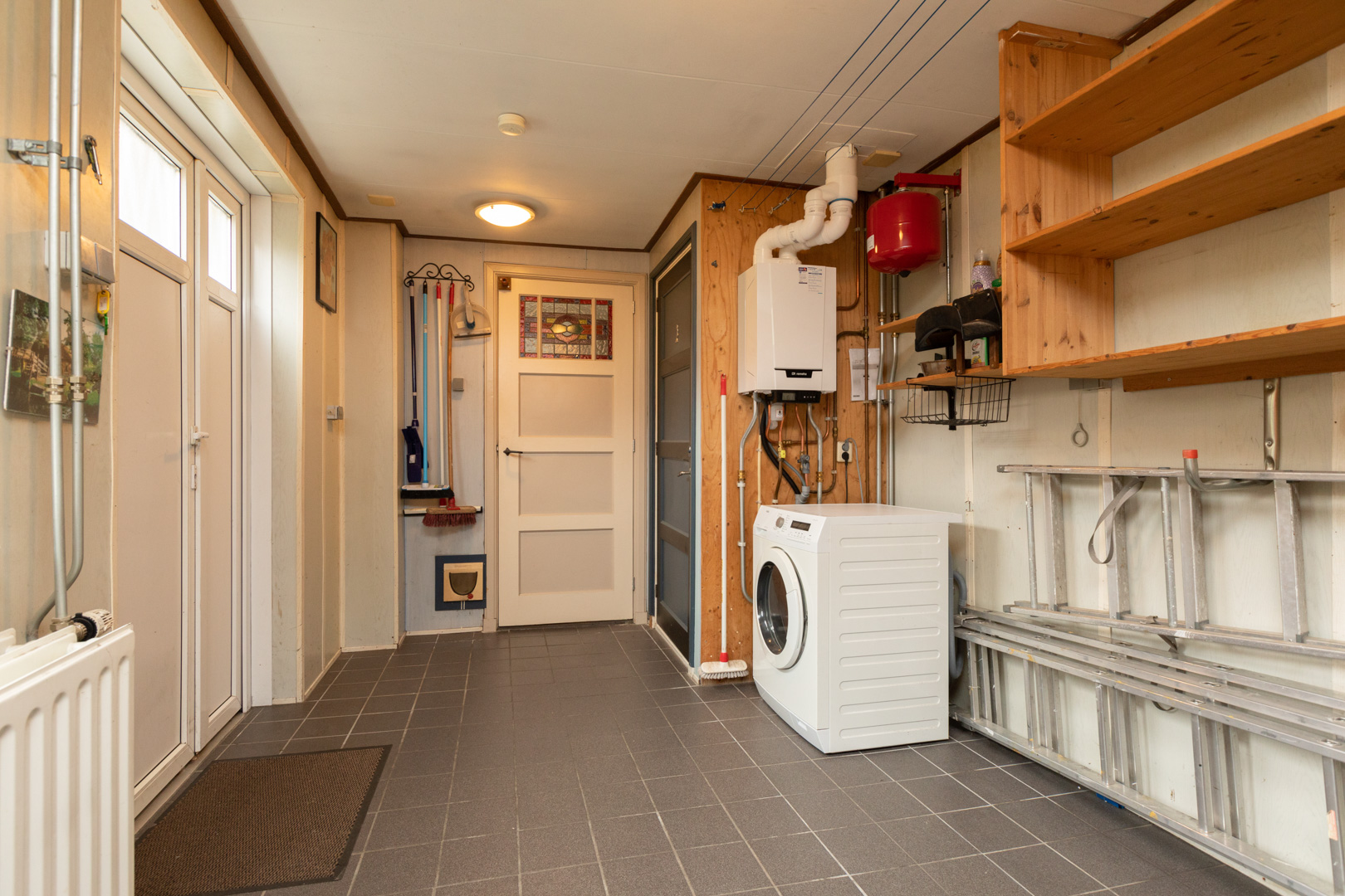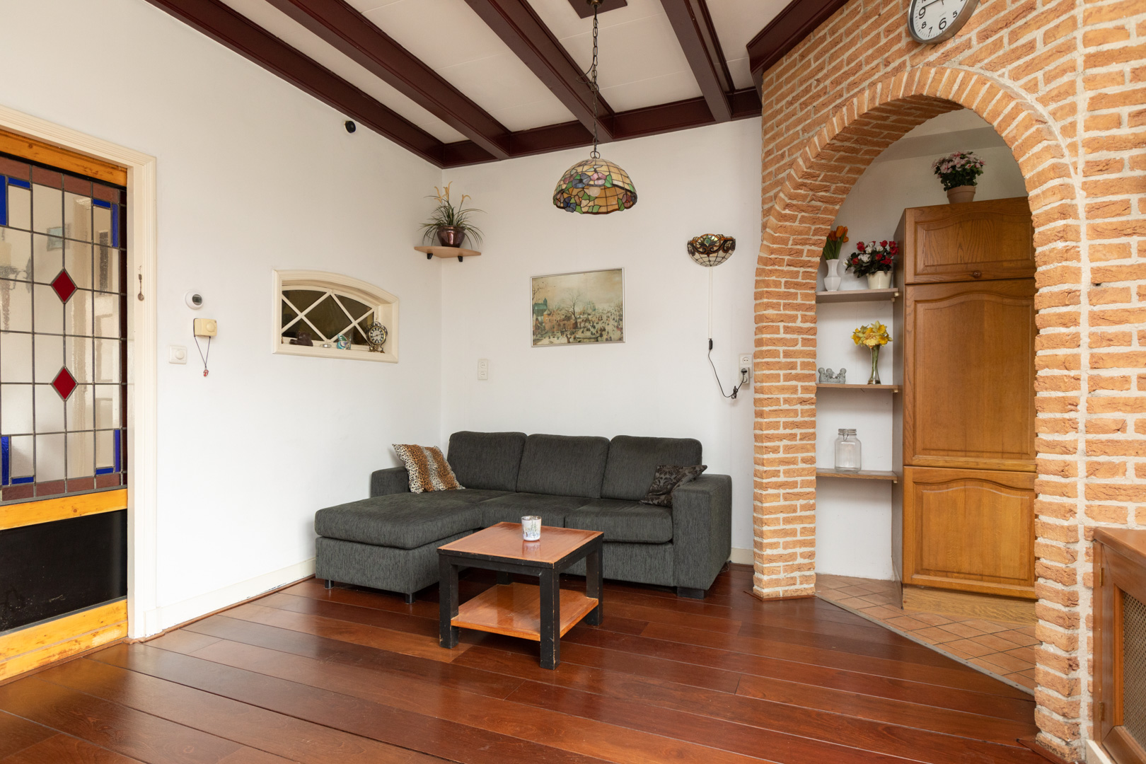 Ruime entree/hal. Meterkast (5 gr./aardlek). Trapopgang. Bergruimte. De ruime en sfeervolle woonkamer (ca. 29m2) heeft een brede erker in de voorkamer, suite deuren (glas-in-lood) tussen de voor- en achterkamer, een balkenplafond, houten vloerdelen, een rookkanaal met houtkachel, betimmerde vensterbanken en een schoonmetselwerk boog maar de aangebouwde keuken. De half open keuken heeft een tegelvloer en een licht eiken inrichting met inbouwapparatuur (5 pits gaskookplaat, afzuigkap, oven, koeler). Grote bijkeuken/berging (ca. 14m2) met tegelvloer, wasmachine/wasdroger/vaatwasmachine aansluiting, witgoed aansluitingen en een wc. Vrij gelegen achtertuin op het zuidoosten ingericht met sierbestrating en zitkuil. Achterom via steeg. Aangelegde voortuin.
