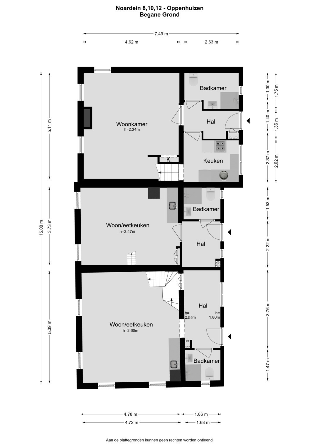 Alle drie woningen hebben een woonkamer, een keuken, een hal en badkamer met douche, wastafel en wc op de begane grond. Op de verdieping hebben twee woningen een zolderruimte en één woningen, de meeste zuidelijke in het blok, heeft een slaapkamer.