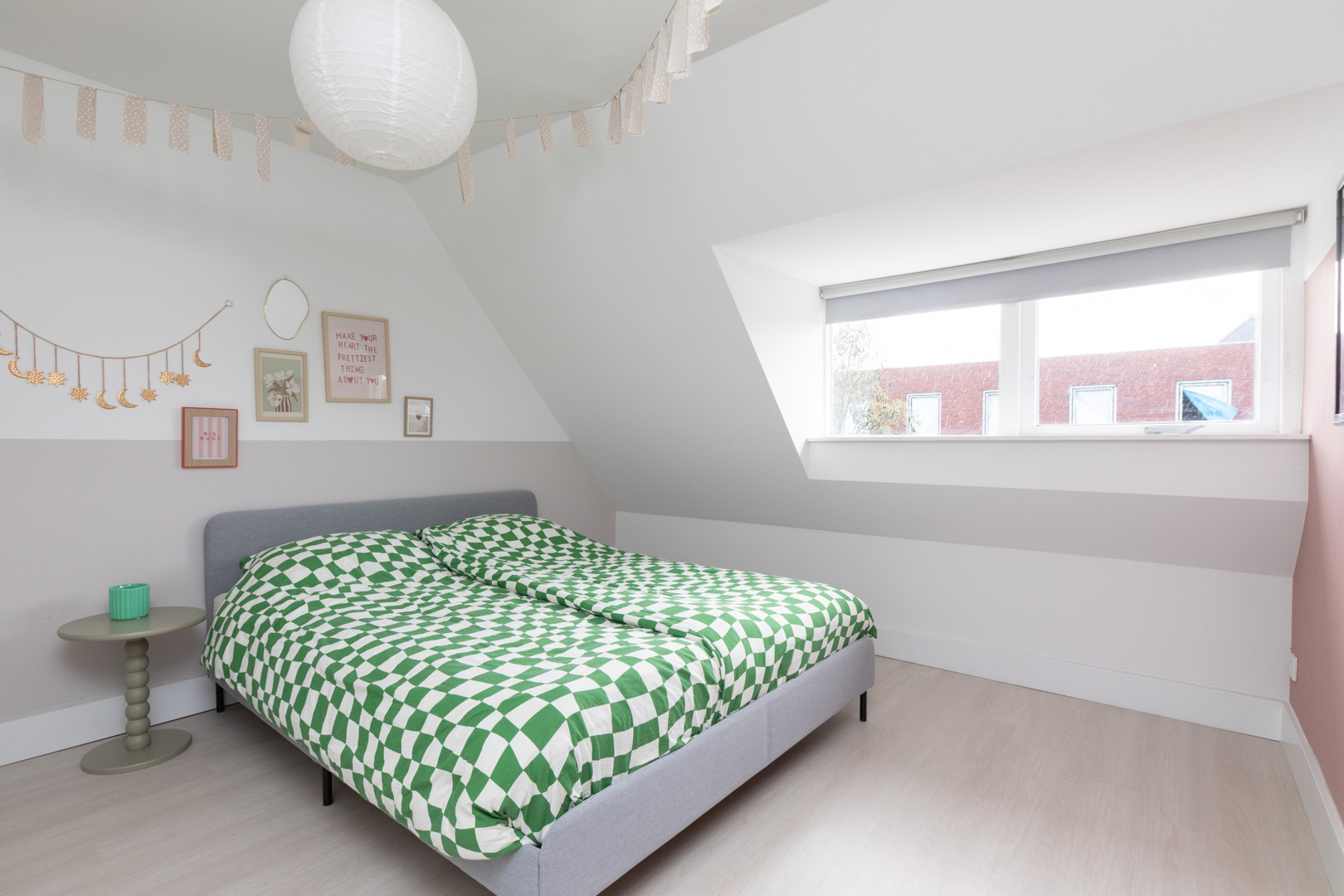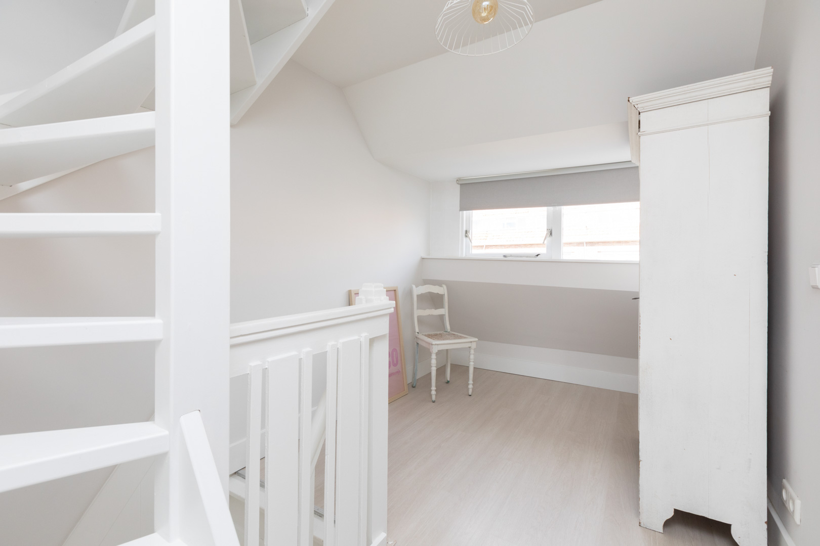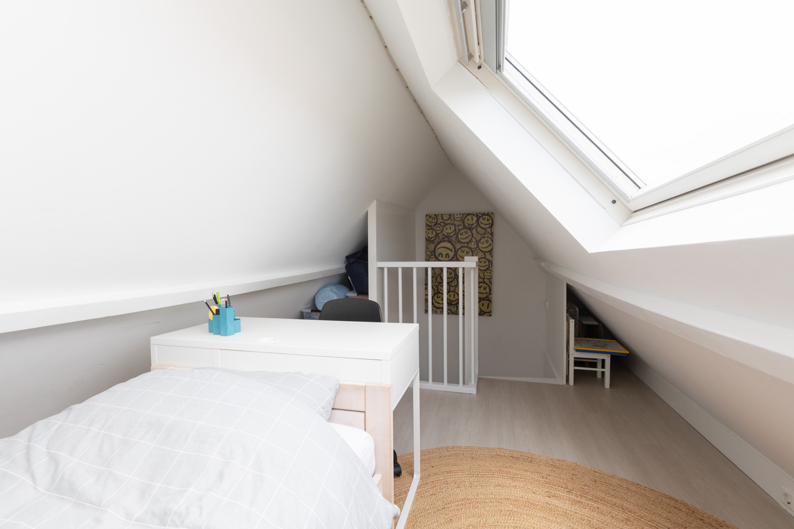 Vaste trap. Vierde slaapkamer (ca. 5m2) met laminaatvloer, groot dak-/kantelraam en dito afwerking.