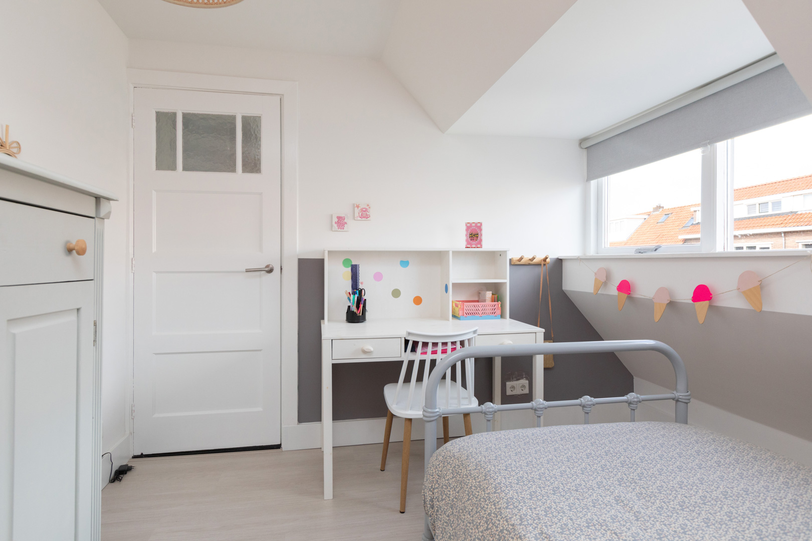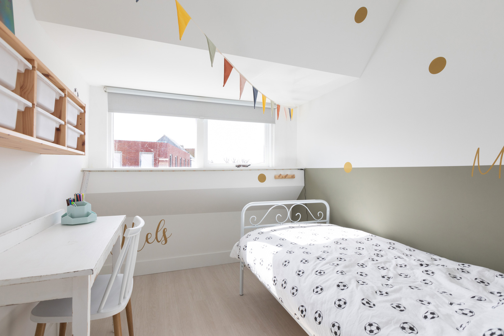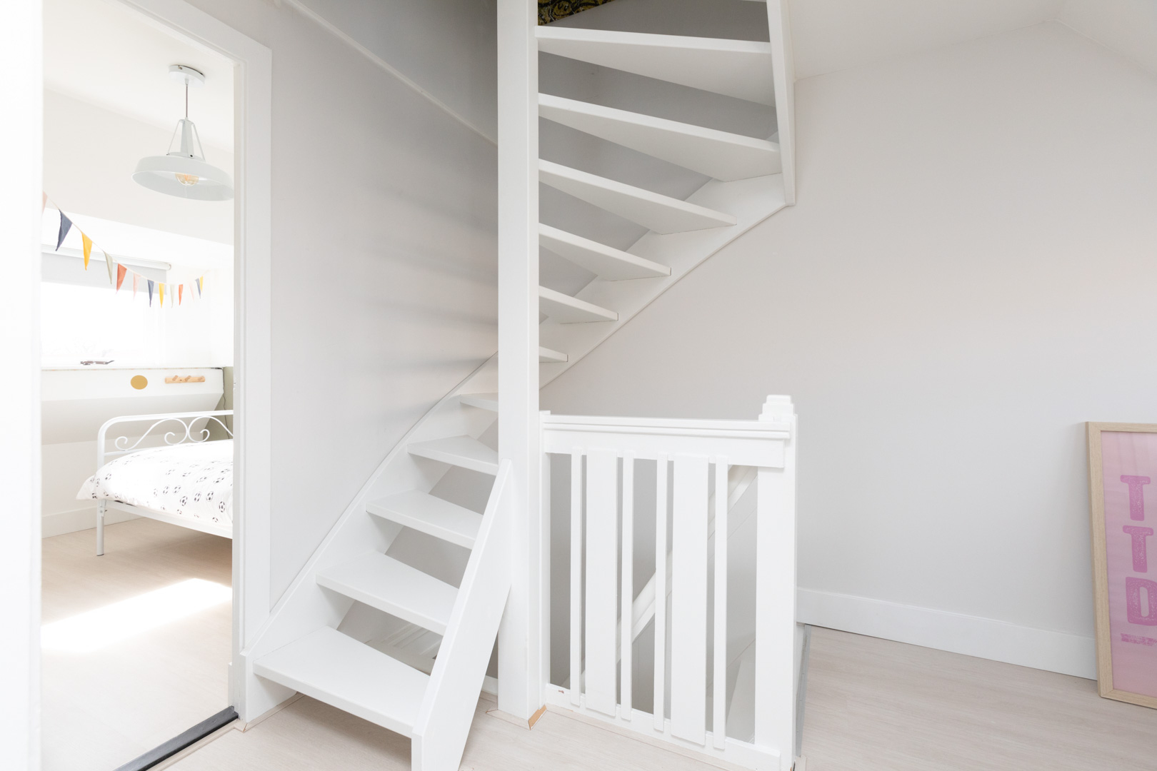 Vaste trap. Vierde slaapkamer (ca. 5m2) met laminaatvloer, groot dak-/kantelraam en dito afwerking.