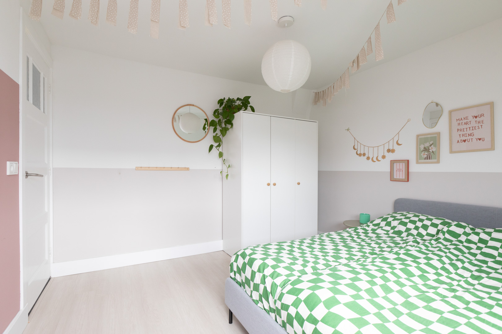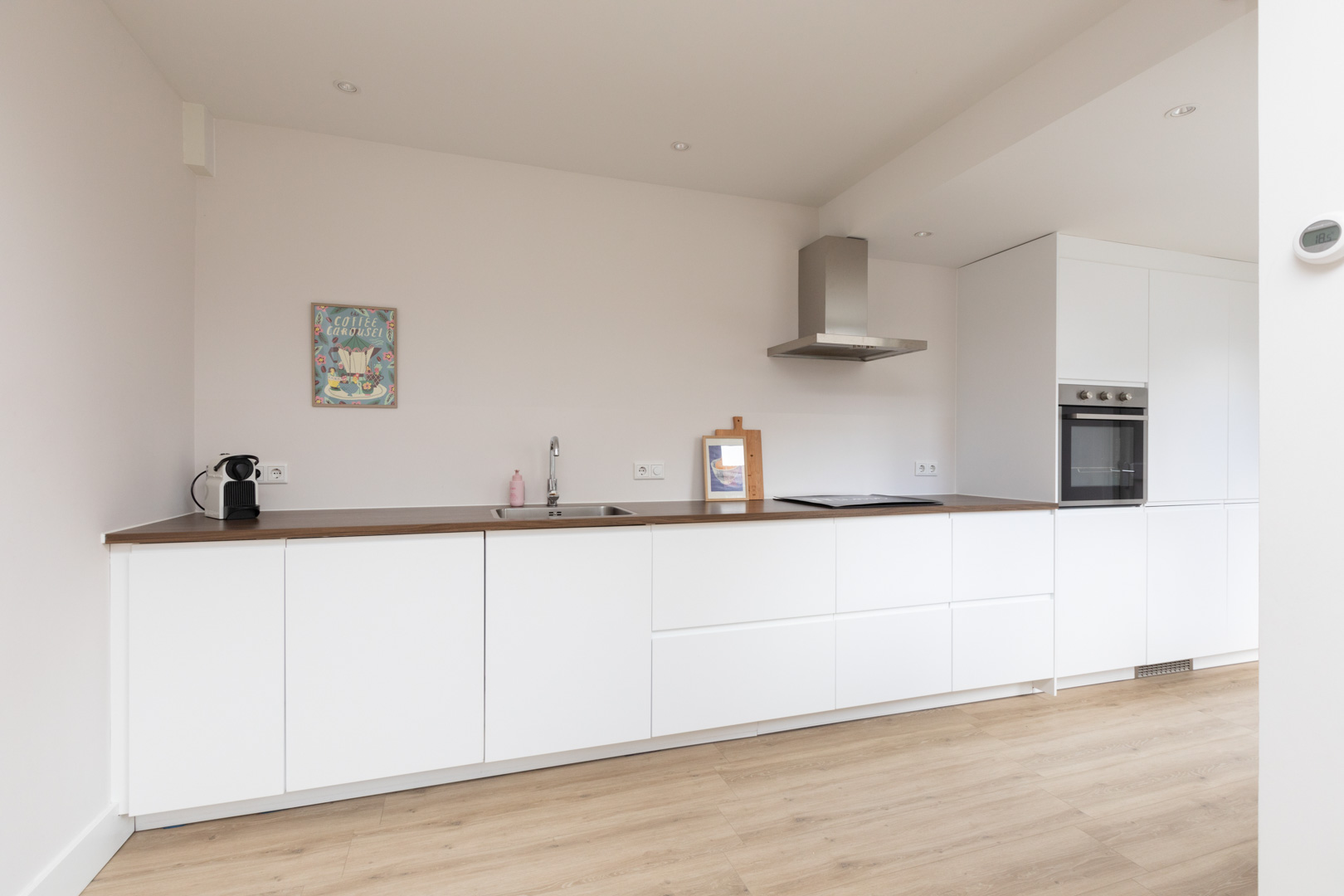 Ruime overloop en drie slaapkamers (ca. 12, 8 en 6m2). De gehele verdieping is voorzien van een moderne laminaatvloer en strakke wand- en plafondafwerking.